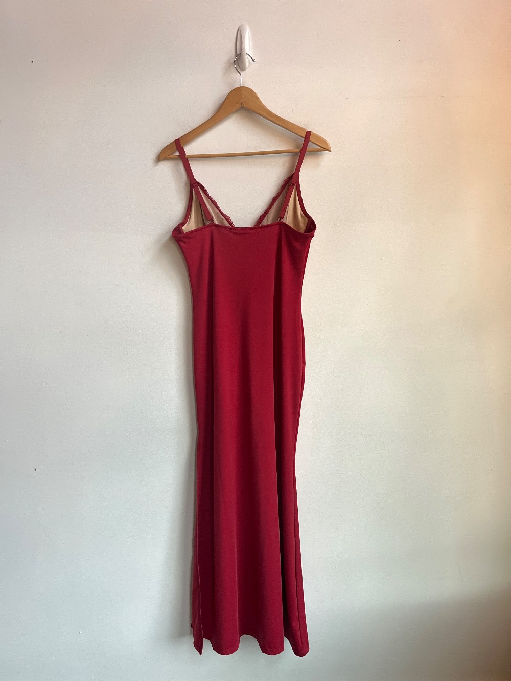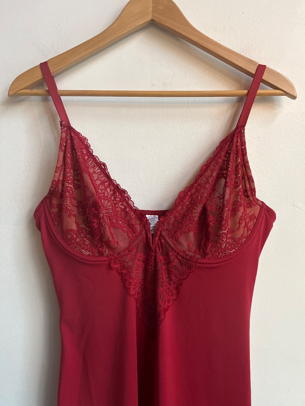 red maxi nylon/spandex nightgown with slit up the leg and built in bra