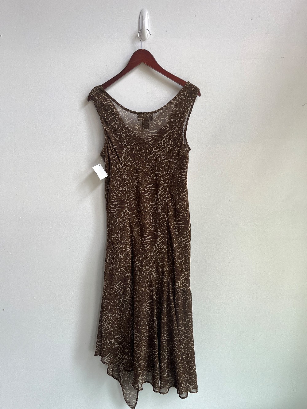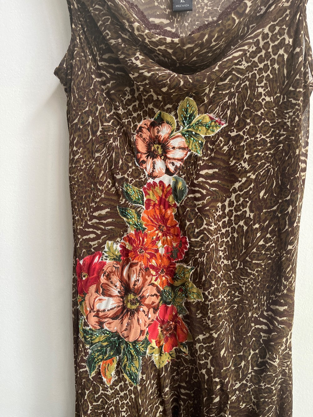Perfect for your next vacation! A sleeveless midi dress with an asymmetrical ruffle hem, wide cowl neck, inner spaghetti strap slip and sequins floral print on front. Fabric is 100% poly- mesh on outer.
