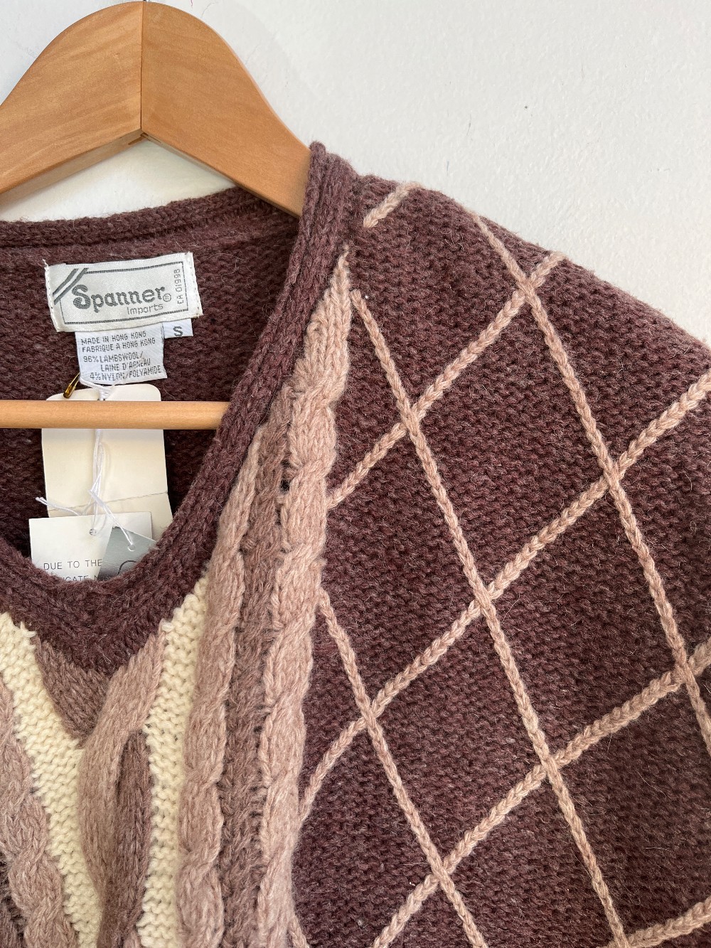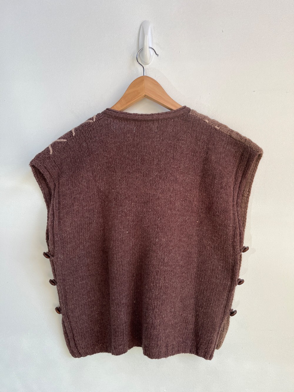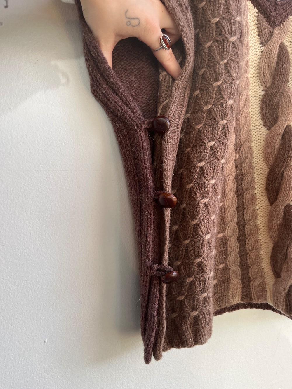 New with tags and comes with extra thread and a button! A intricate piece made from multicoloured brown hues of yarn, blended into cable knits and diamond prints. Features open sides with button decals holding them together.
