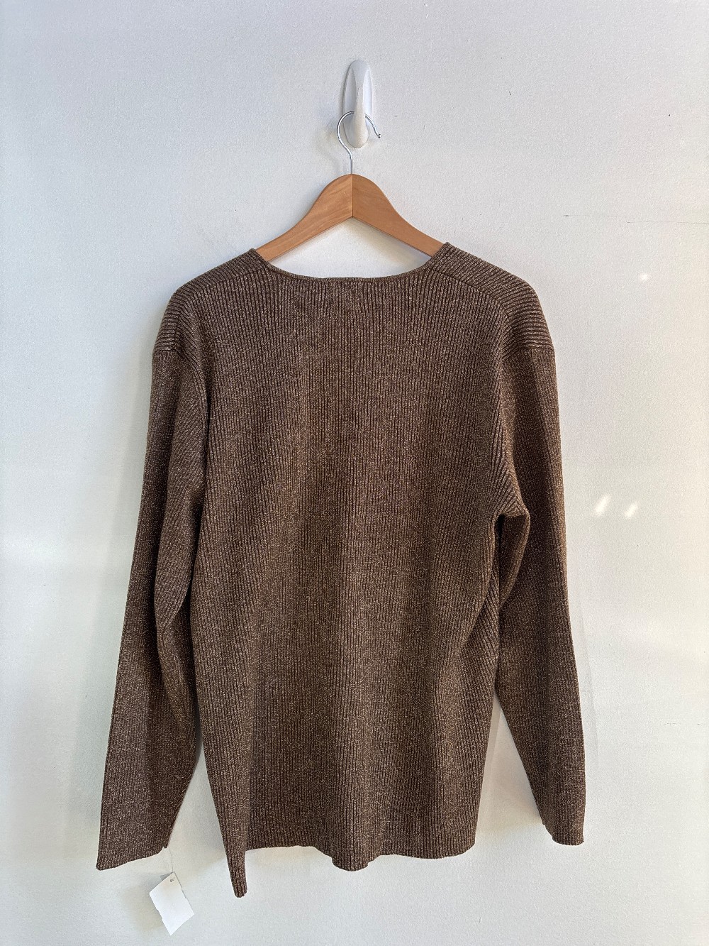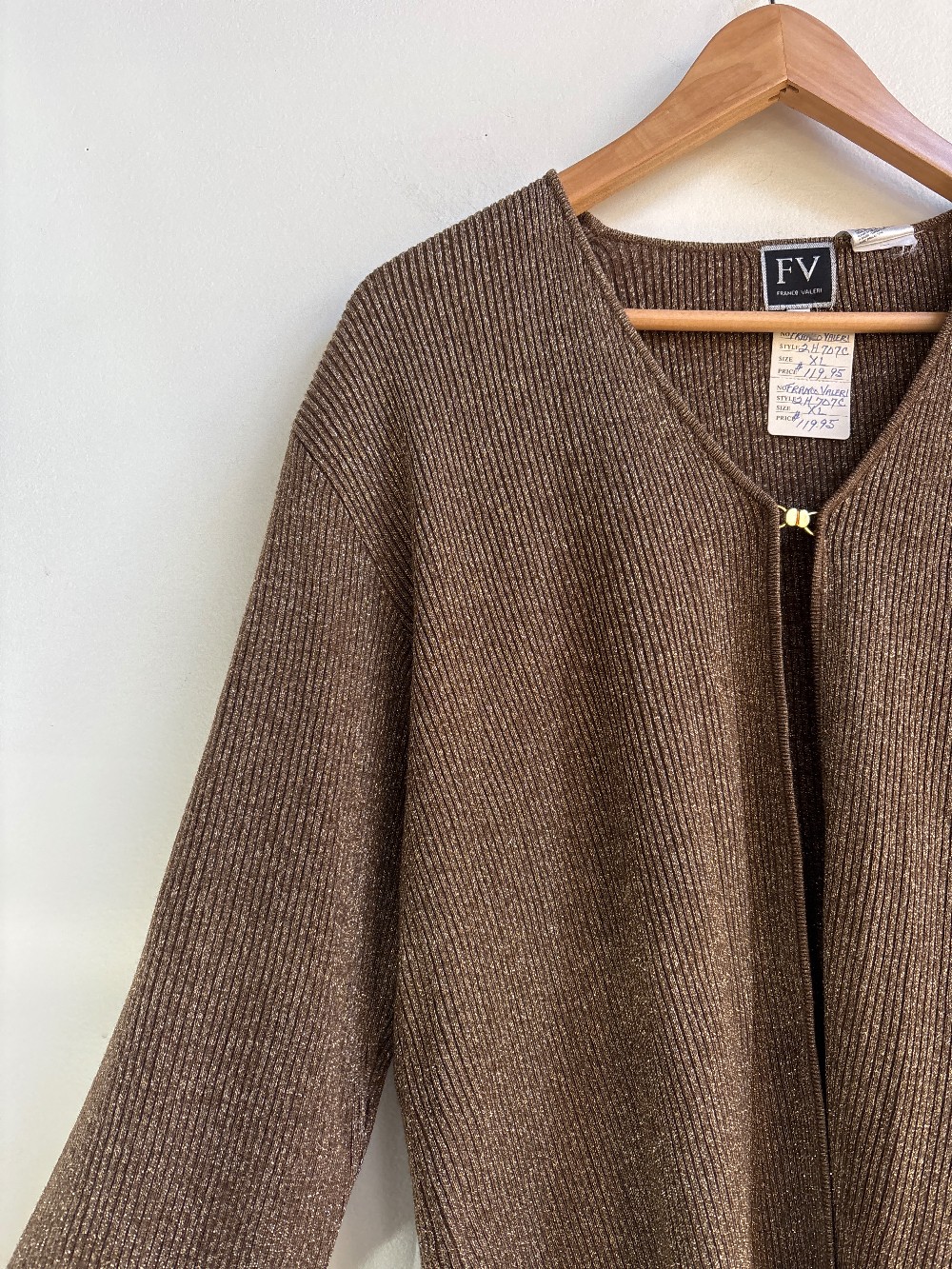 New with tags! A sparkly golden open cardigan with a single snap closure along the upper chest. Features ribbed, stretchy fabric.