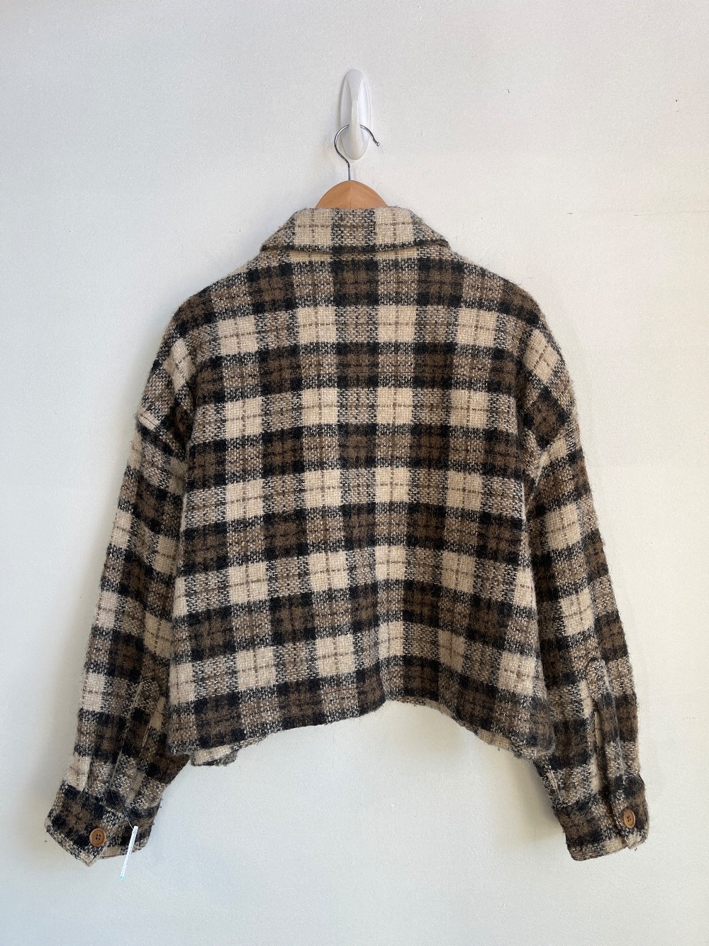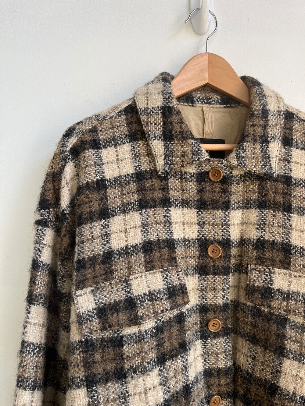 “Soft and textured, this blended fabric uses recycled wool and alpaca hair for warmth. Unlined for easy layering. Point collar and button front.”