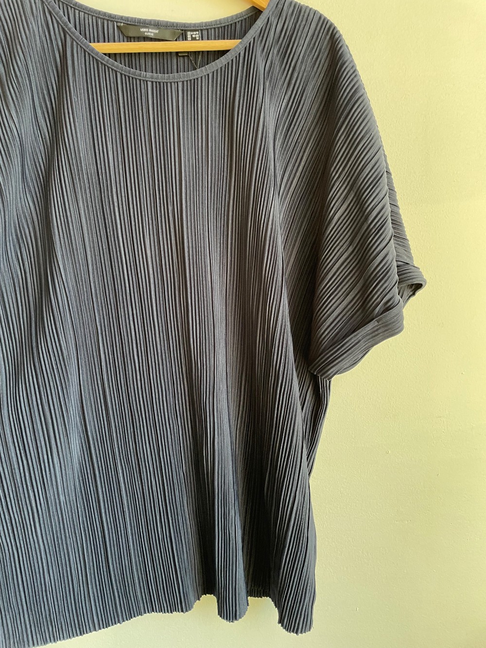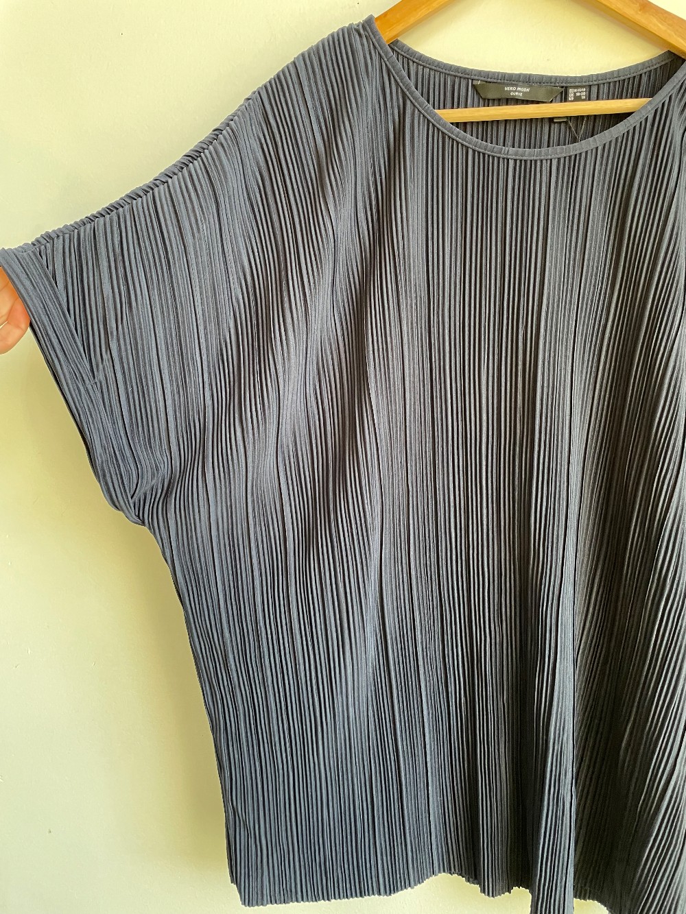 New with tags! A classy pleated top with a satin like material. Fits with a scooped wide neckline, cap sleeves, and a tapered waistline.
