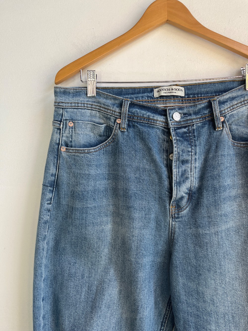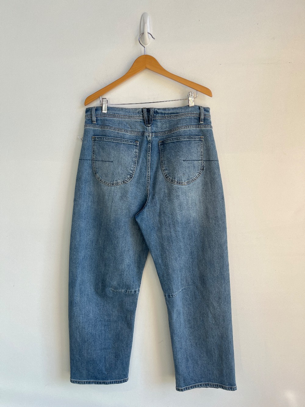 Mid rise barrel blue jeans with a button fly, 5 pocket styling, no stretch denim and subtle barrel legs with a slight crop.