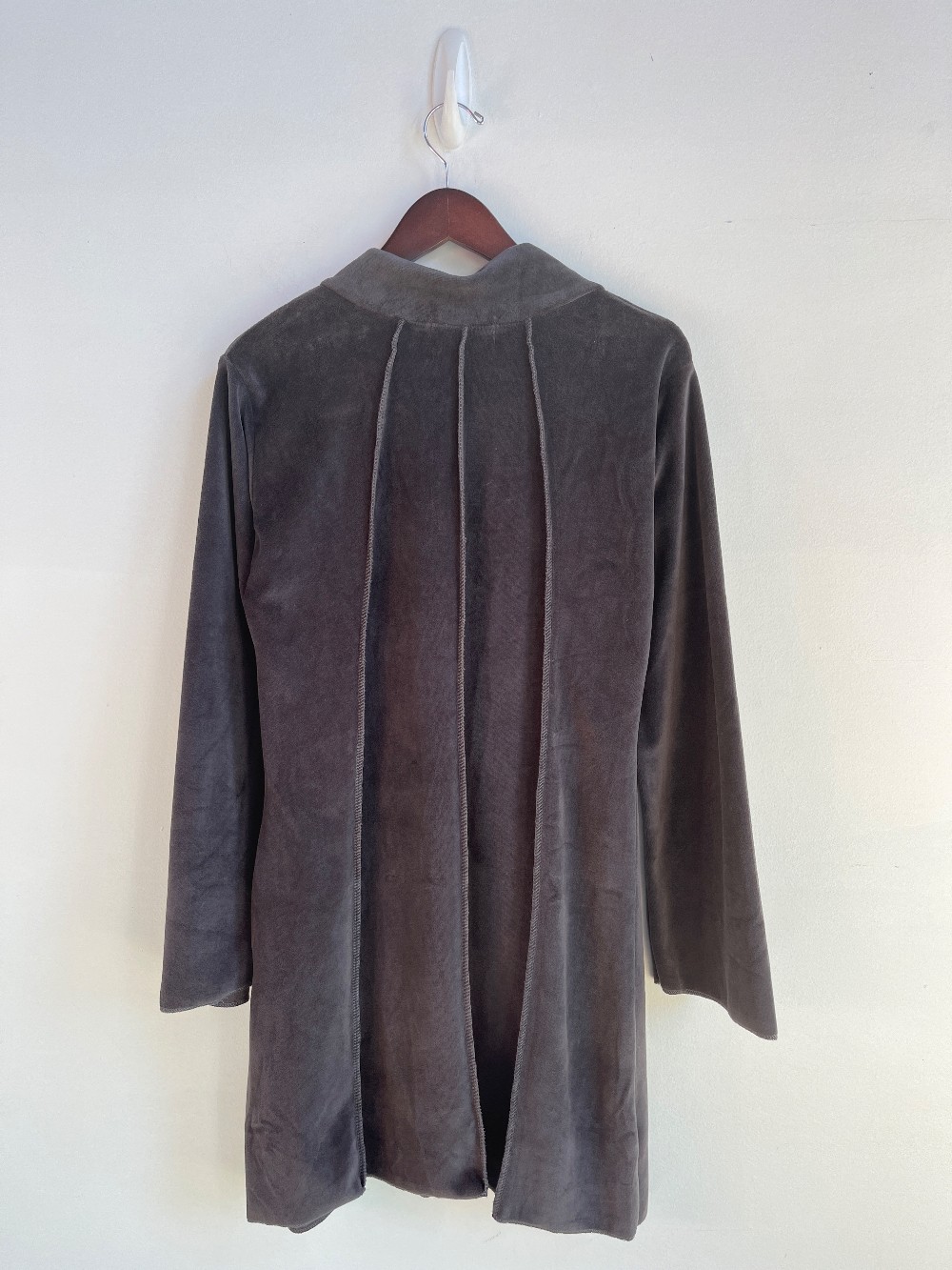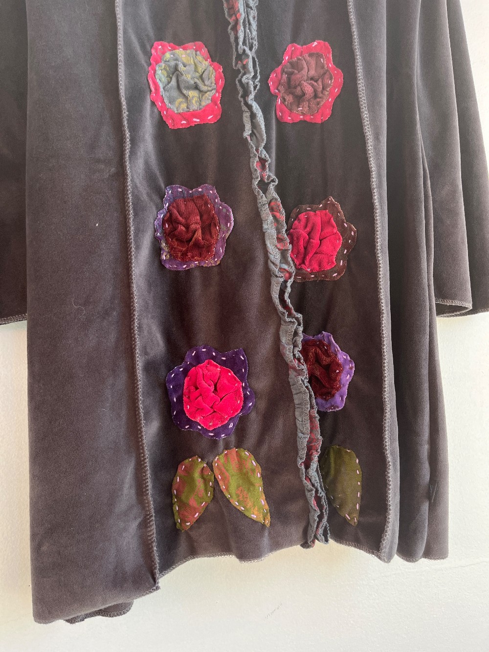 New with tags! A tie front cardigan with grey velour style material. Features multicoloured rose patches along the front.