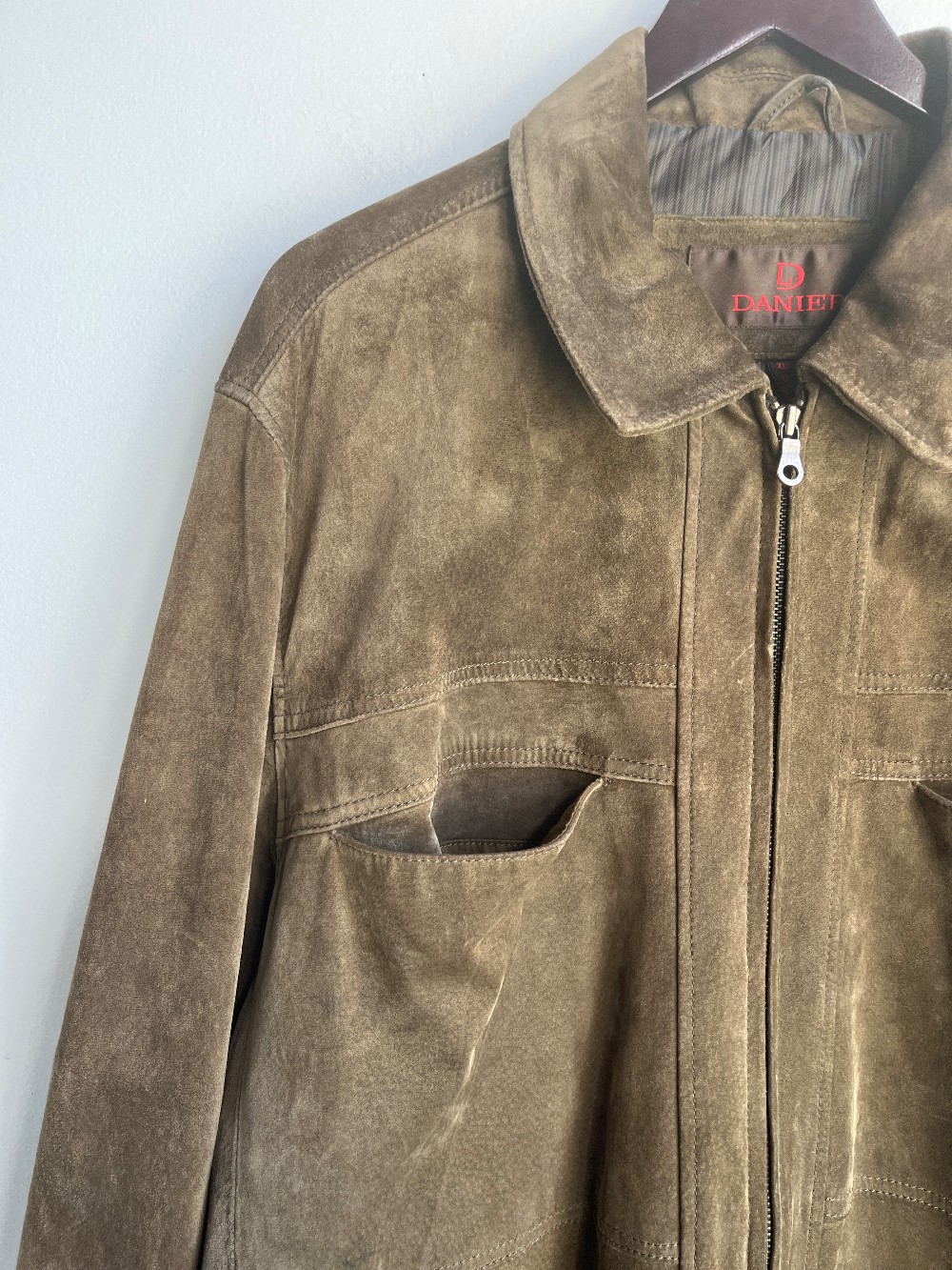 AS IS: small blue markings along the right side, and slight discolouration. Feature a zip down front, four pockets, full sleeves, and a striped satin inner lining.
