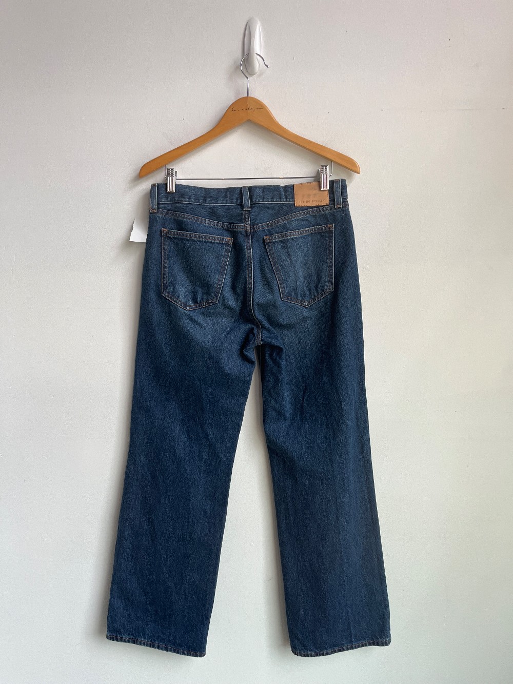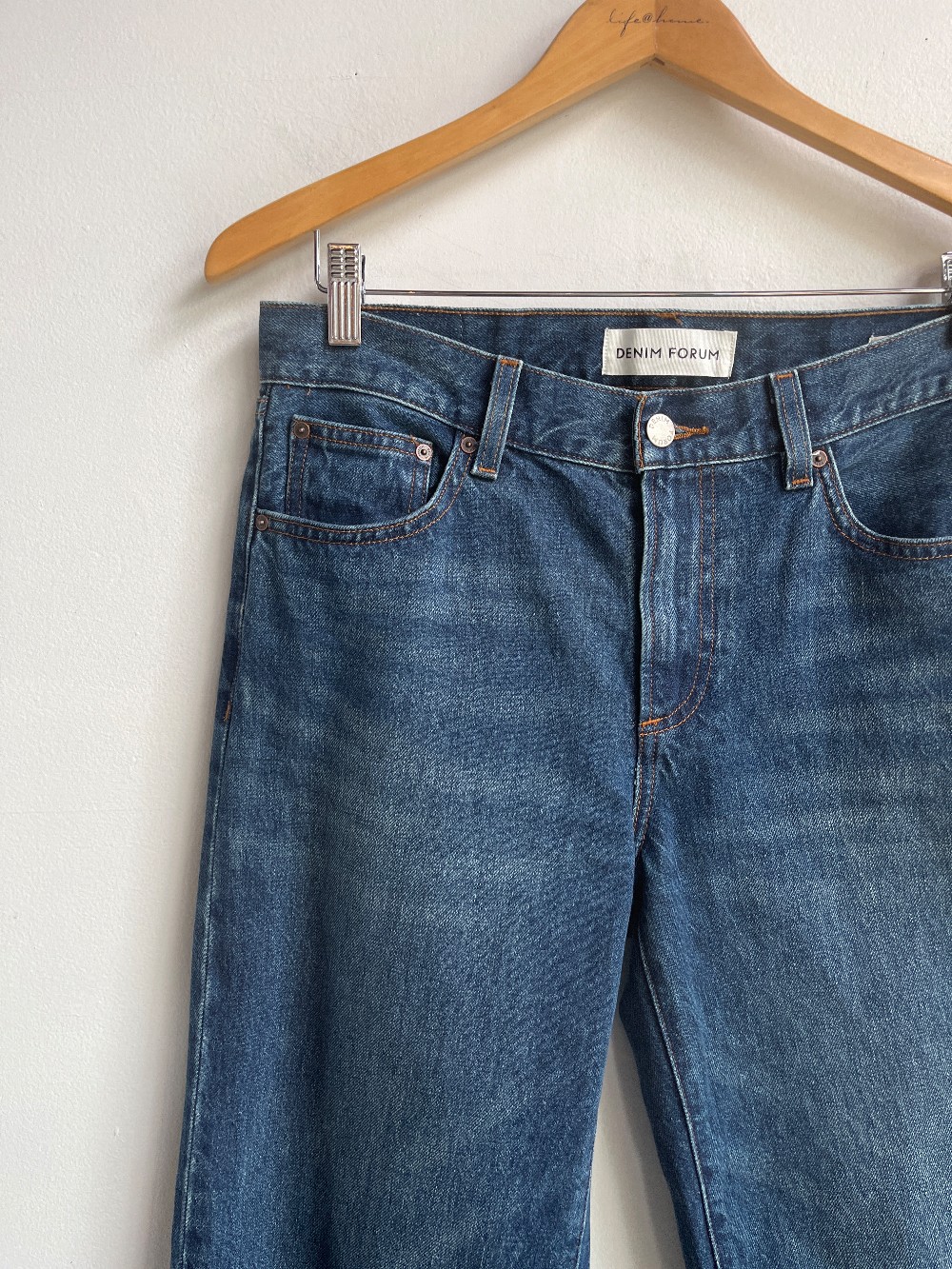“Inspired by bold, adventurous ’70s icons, The Farrah Lo-Rise is the hip-hugging version of Denim Forum's signature wide-leg jean. With a low rise and slim hip, Farrah hugs the figure and flares gradually out from the leg, ending in a clean hem. They’re cut from heavyweight, non-stretch denim that molds to your body over time. This fabric is sourced from a premier Italian mill and made with 100% regenagri-certified regenerative cotton. So go ahead, ride a skateboard. Fight crime. But do it with big hair. This version comes in a light-medium indigo wash.”