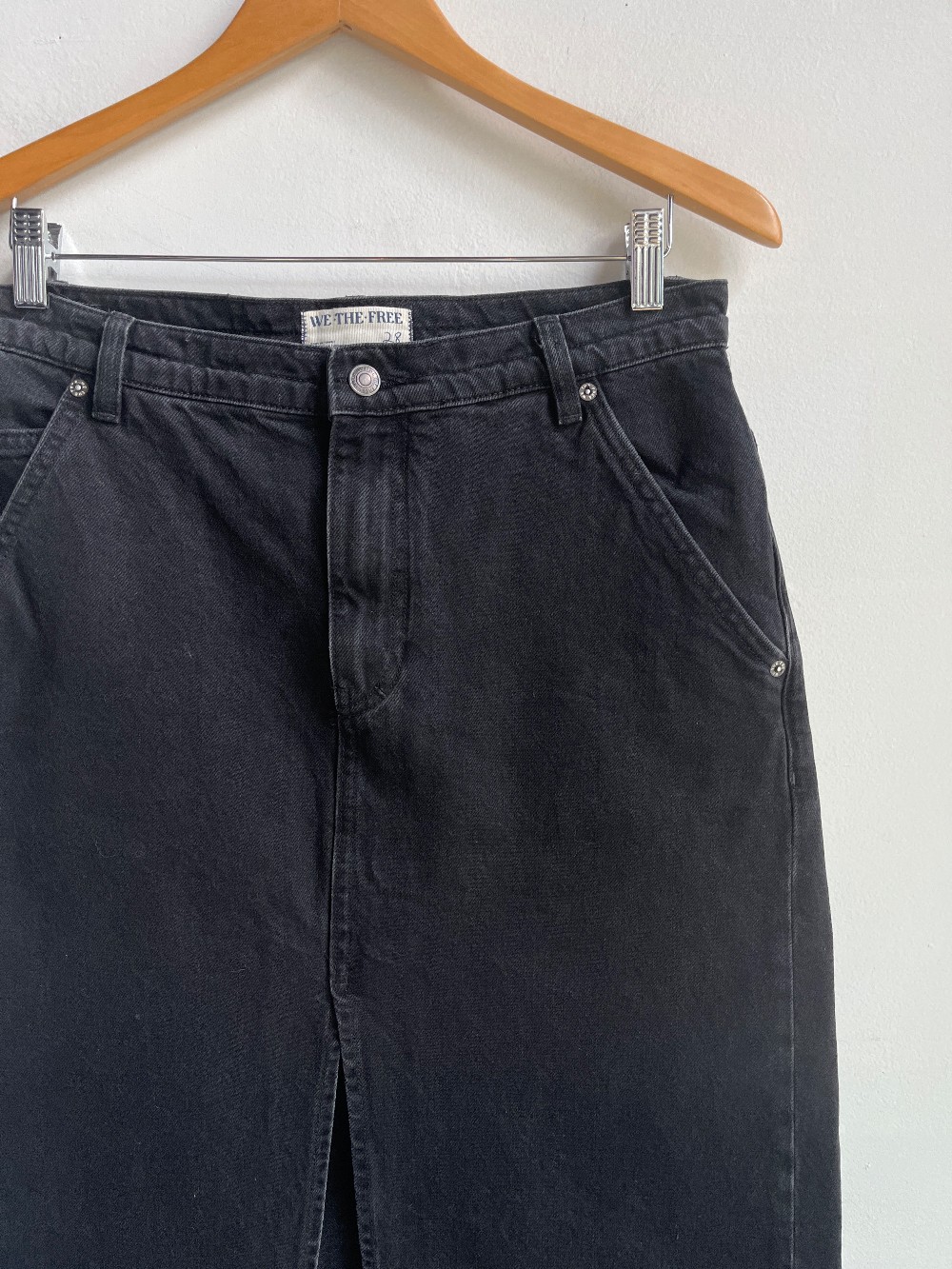 “ Forever cool with a retro-inspired touch, this stunning midi from the We The Free collection will be a staple in your forever wardrobe” Features: Zip fly and button closure, five-pocket design, front slit hem feature, authentic rigid denim