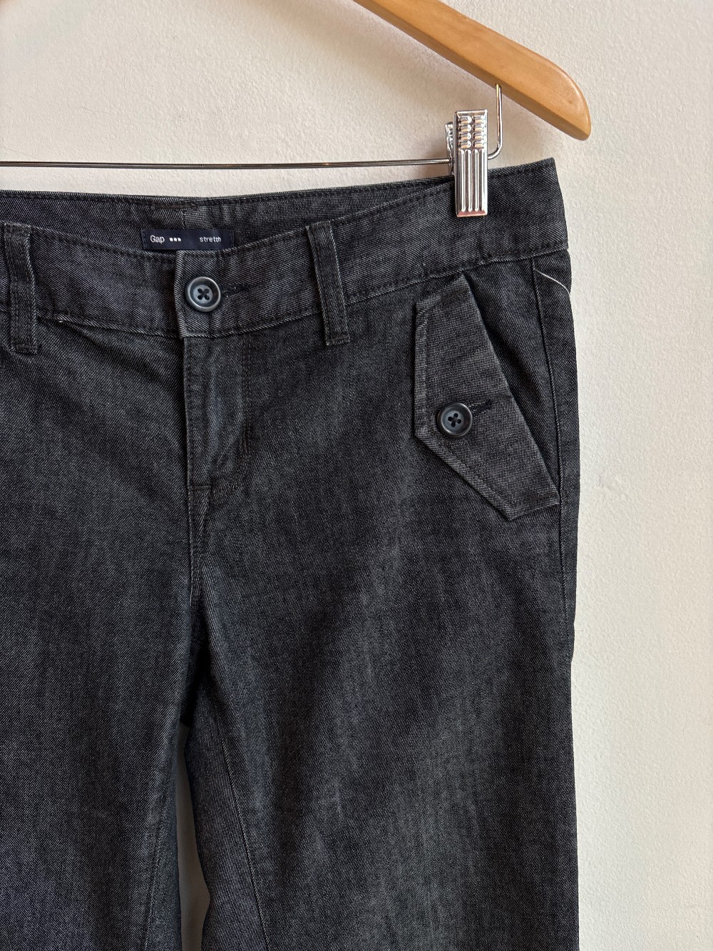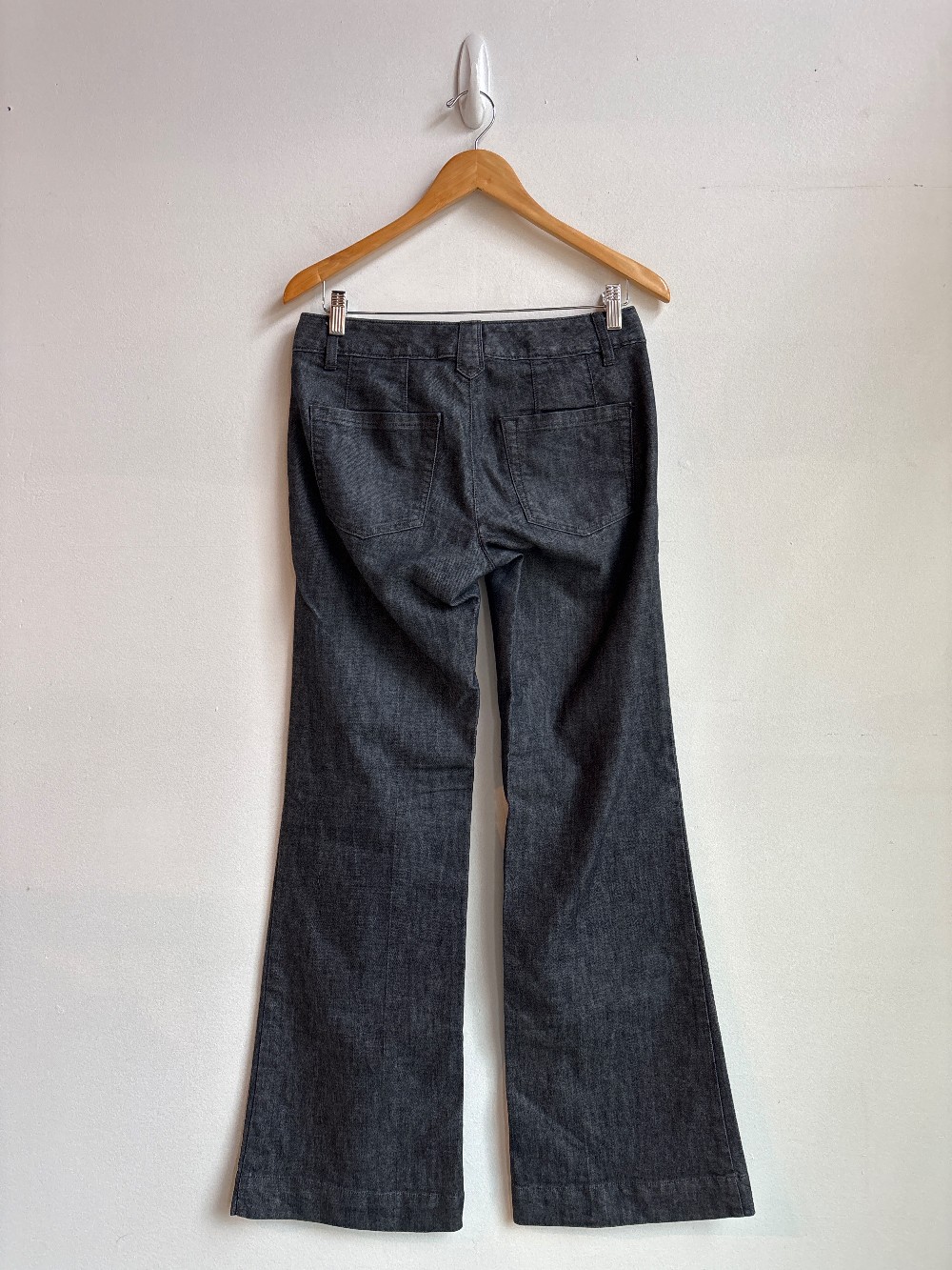Trendy jeans in a low rise, zip fly, 4 pocket styling, full length leg and flared fit. Material is stretchy and light