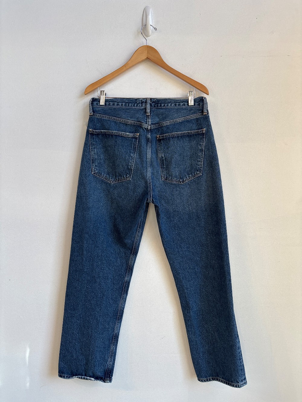 Relaxed-fit non-stretch regenerative cotton denim jeans. Fading and whiskering throughout. Straight leg silhouette with a high rise, button fly and 5 pocket styling.