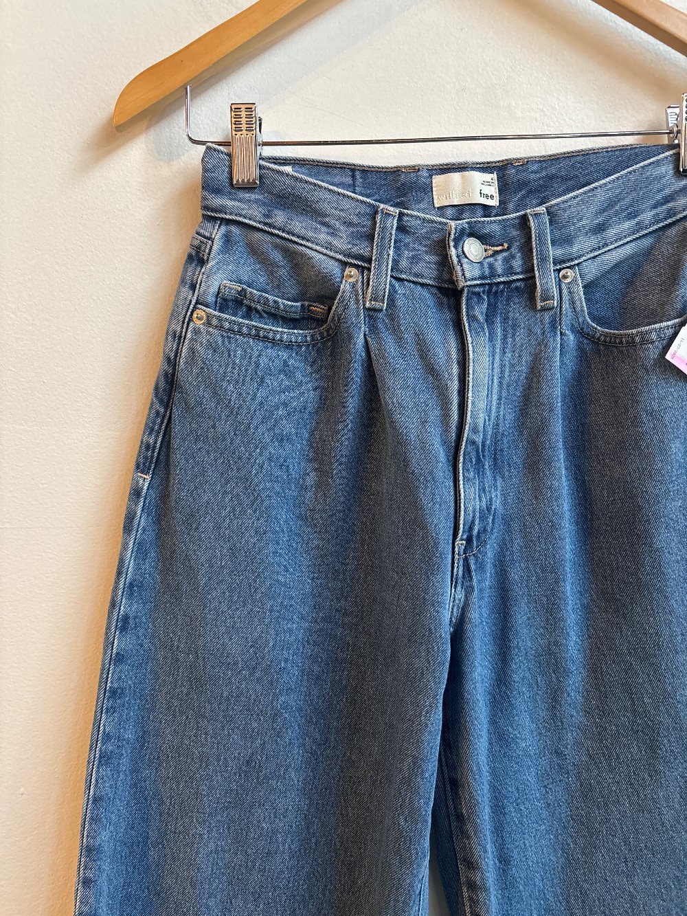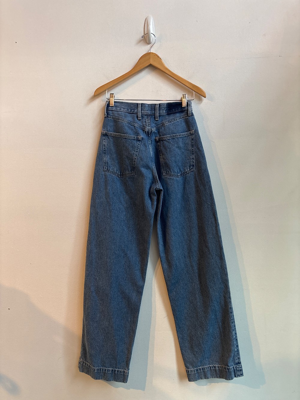 High rise wide leg jeans with a clean hem, pleating from waist. 5 pocket styling with a zip fly.