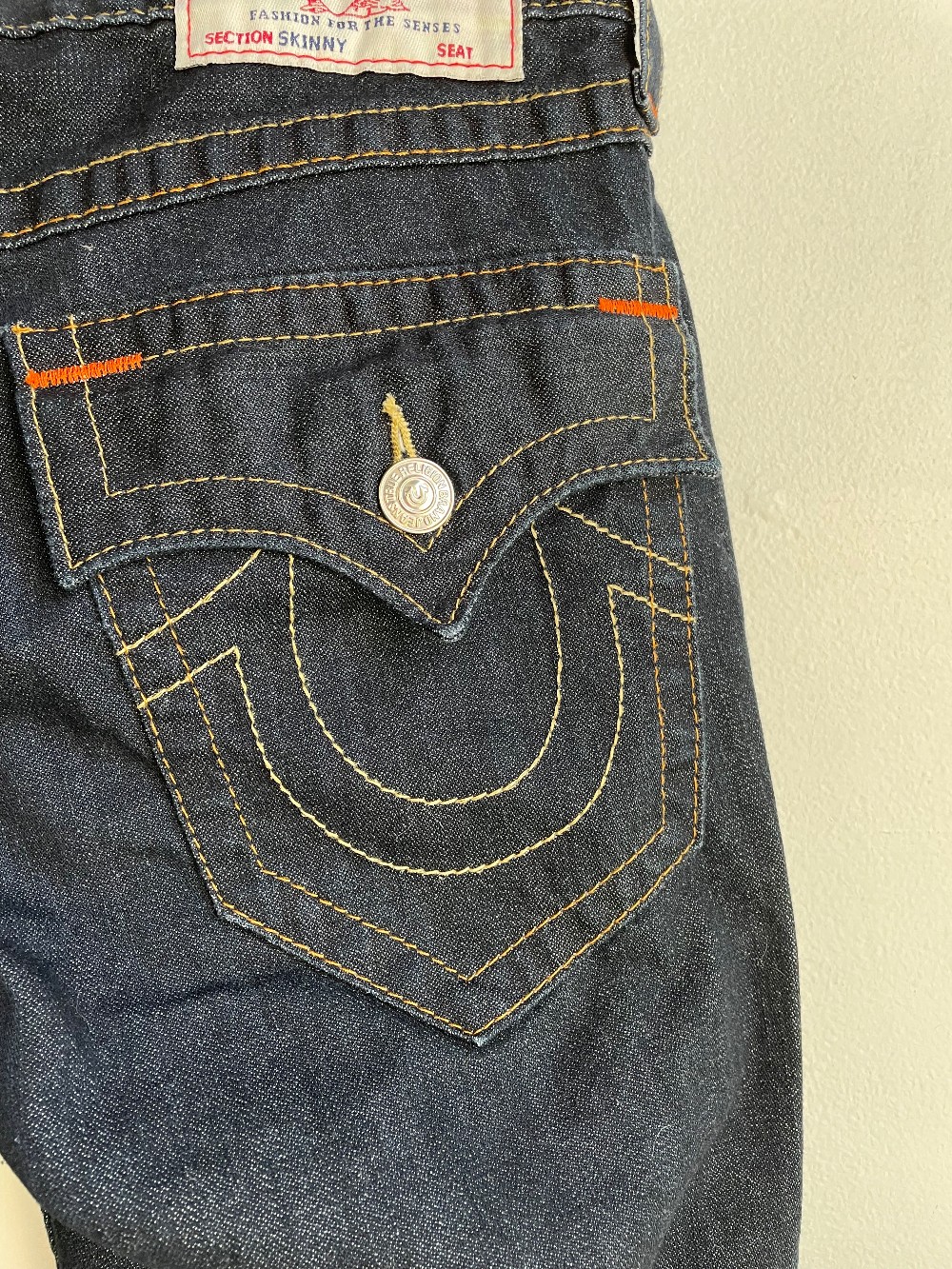 Decorative pockets and accent threading with a low rise fit, pockets, and a zip fly. Made from a dark wash denim.