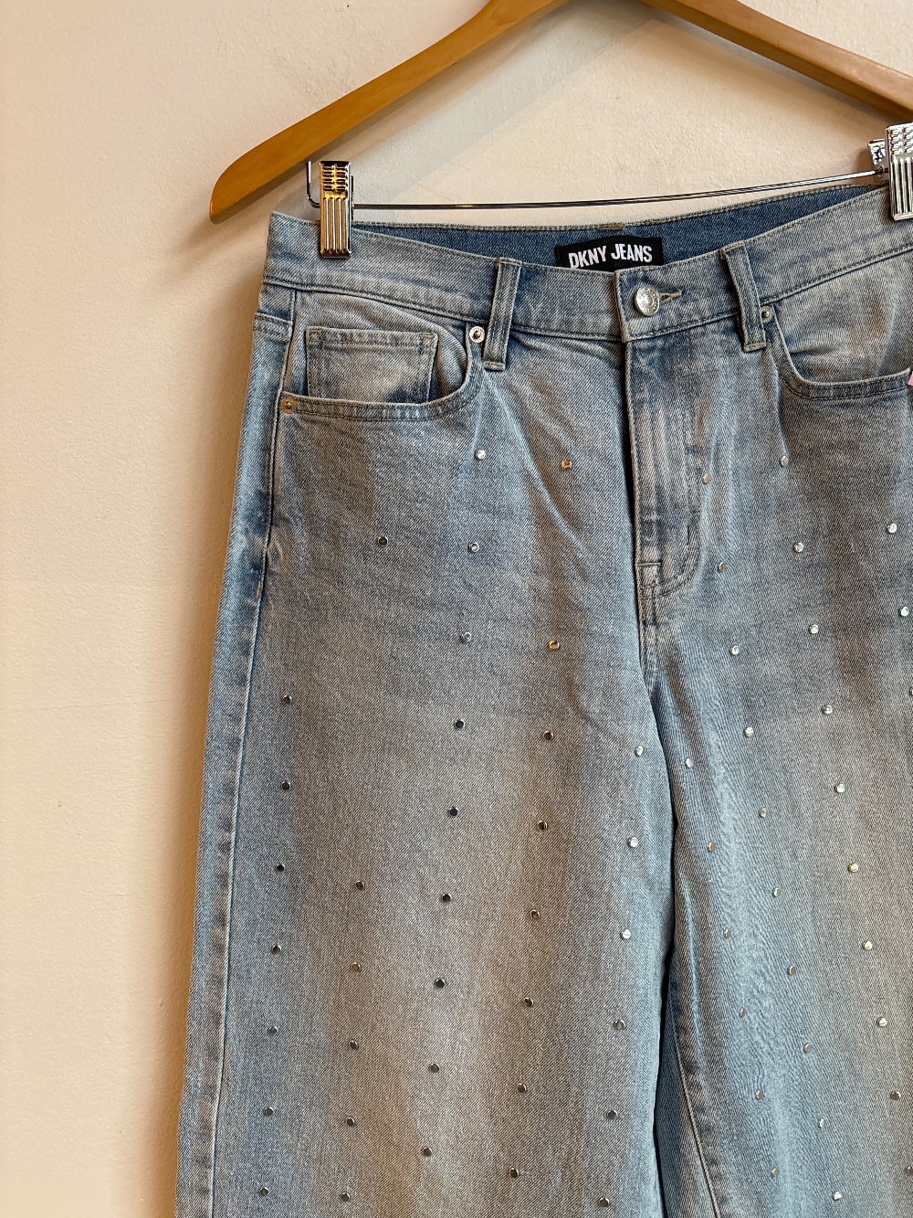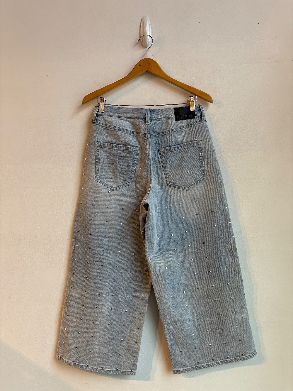 A light wash pair of wide leg, mid rise jeans. Featuring silver hardware studs along the front and back legs. Has a zip fly five pockets and belt loops.