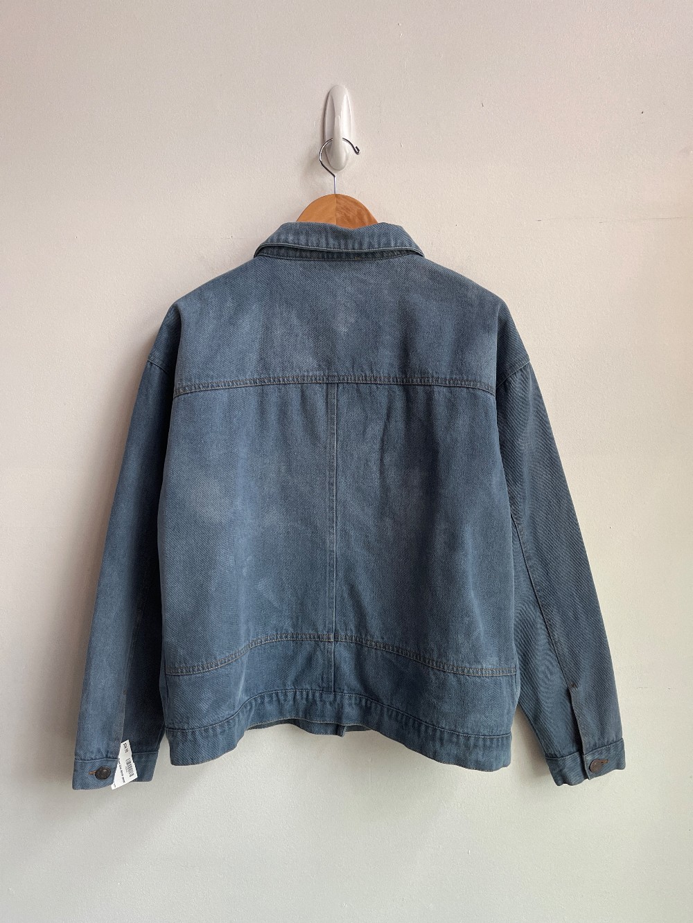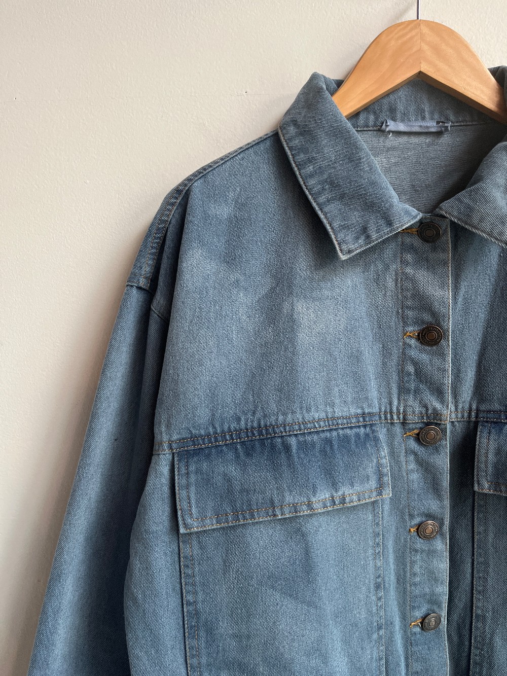 A relaxed bomber style denim jacket with a muted shade of blue. Features a button down front, point collar, and two large front pockets.