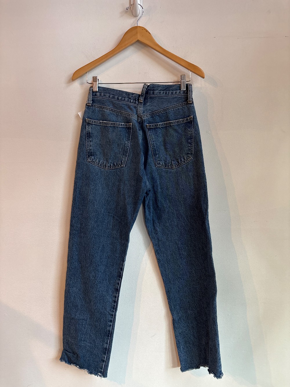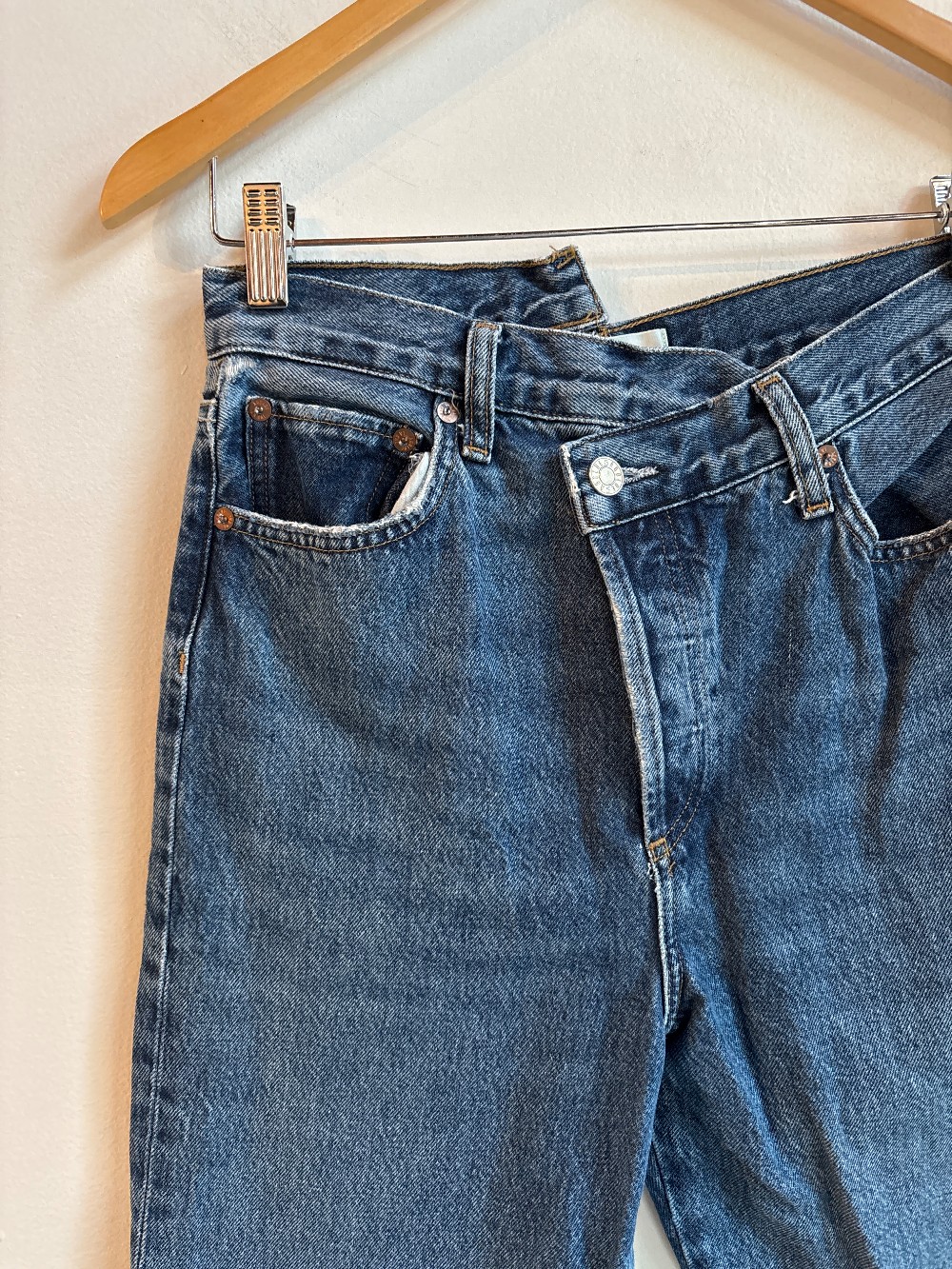 Valued at $300! A streamlined take on a cult favourite, these are high-rise jeans with a straight silhouette, offset back waistband and a criss-cross button front. They’re made from non-stretch 100% organic cotton denim. This version comes in a washed black with a raw hem.
