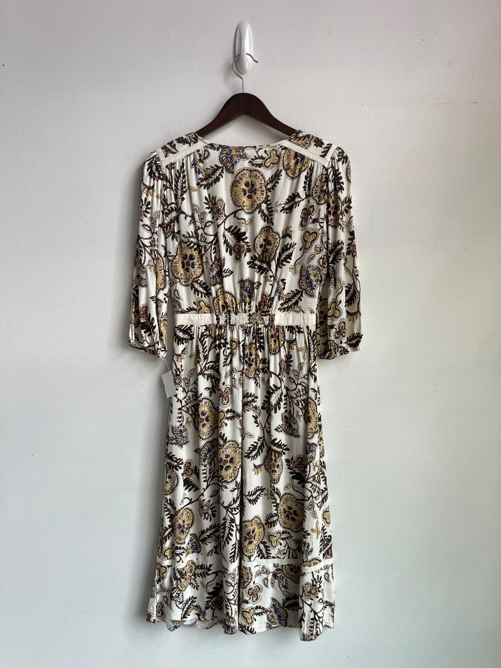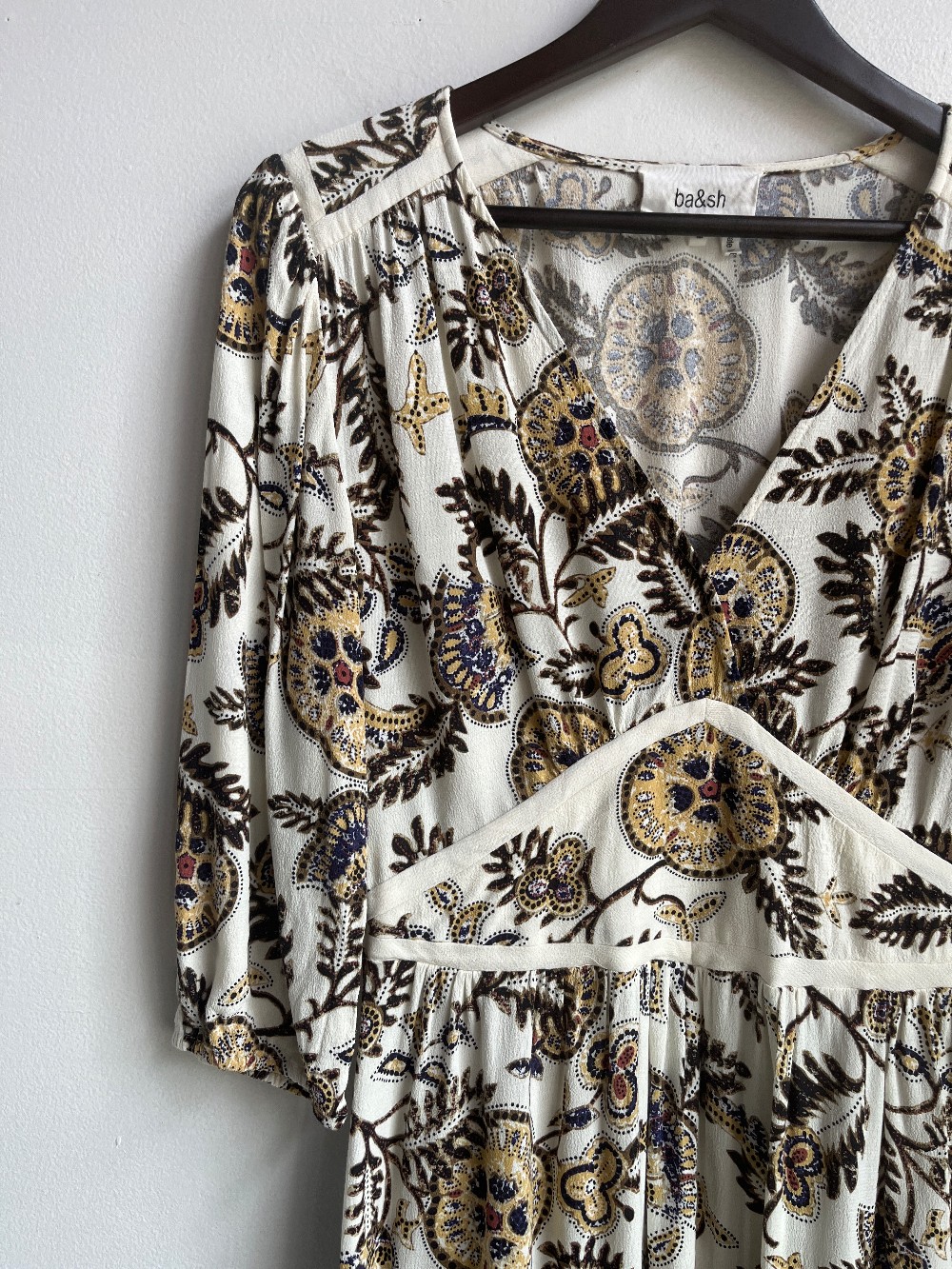 “This bohemian-inspired style has a delicate floral print and a V-neck for a gorgeous feminine feel. We love the flattering details such as the inverse V-shaped belt and the waist gathers. This dress is light and lovely to wear in any season. 100% viscose. 3/4-length sleeves.”