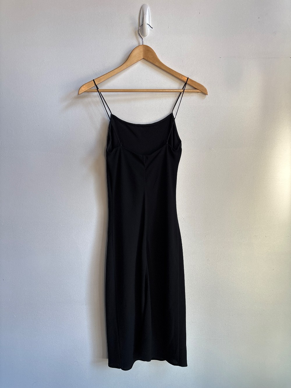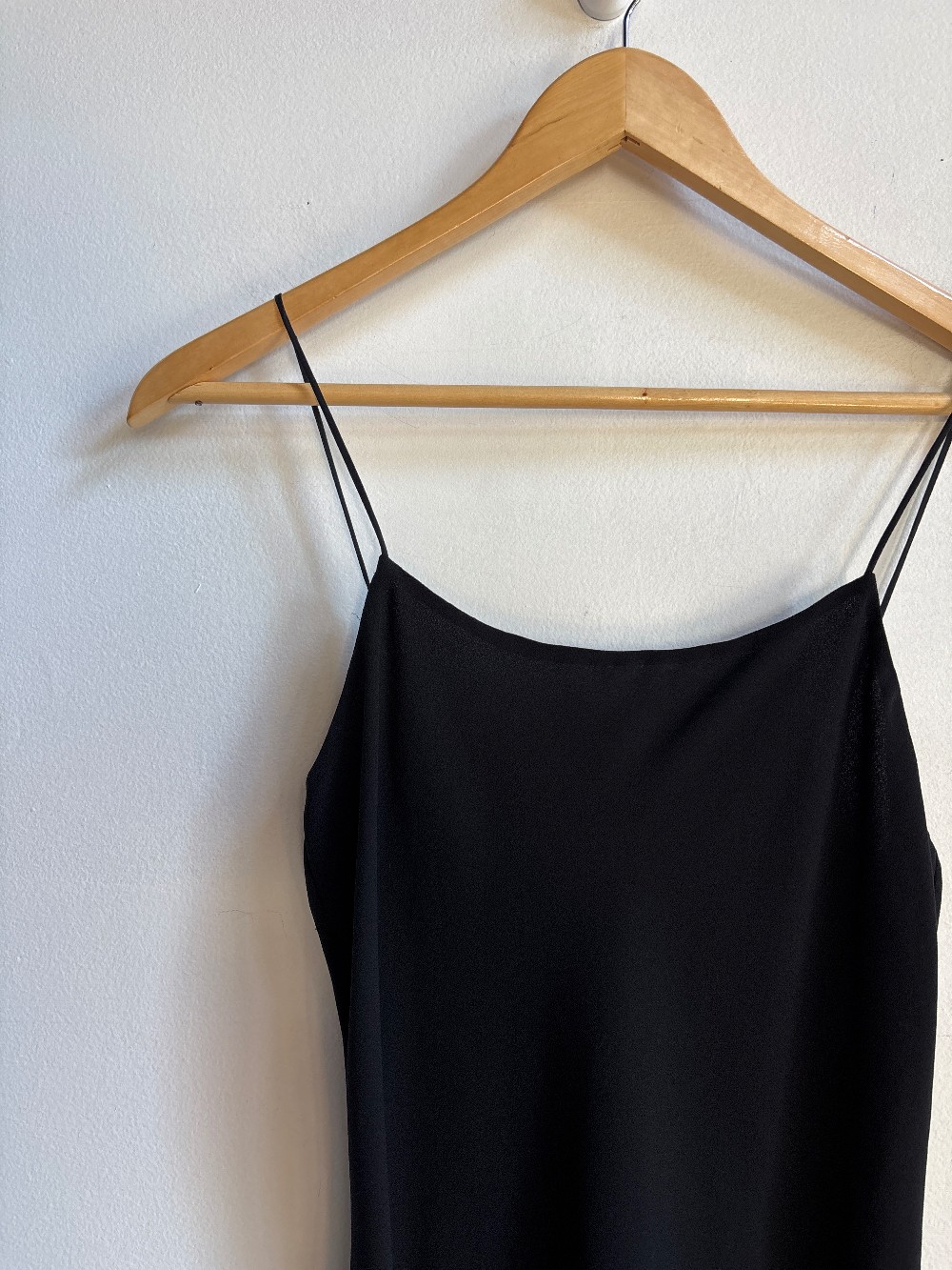 Th perfect little black dress. Elegant midi length cami dress with a close to body fit, spaghetti straps and lightweight fabric.