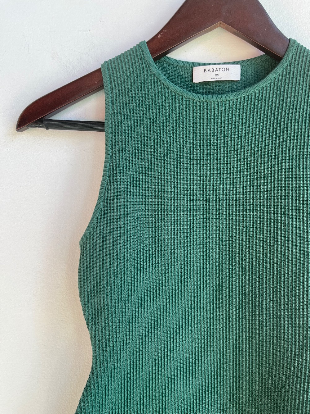 “This is a racerback mini dress with a crew neckline and fully fashioned construction. It’s made with Sculpt Knit — our signature figure-enhancing yarn. This compressive, all-season fabric holds you in all the right places to shape and sculpt your form. Like nothing else. This garment is constructed using an Ottoman stitch with close distinct ribs for a structured and textural feel.”