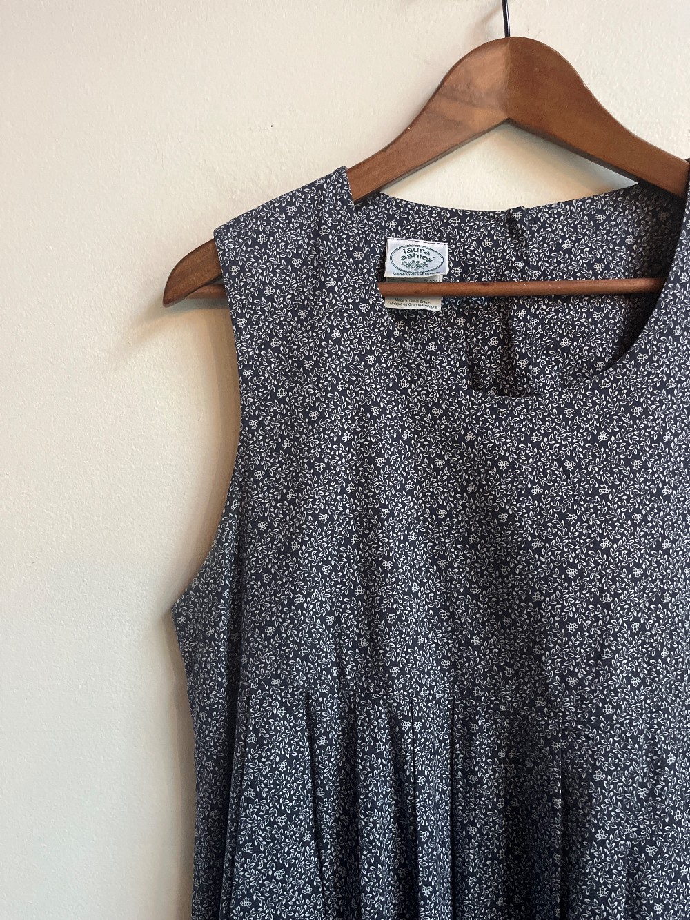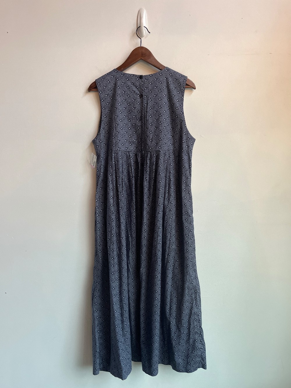 Sleeveless maxi length dress with an allover floral pattern, pleated detailing at waist and front patch pockets