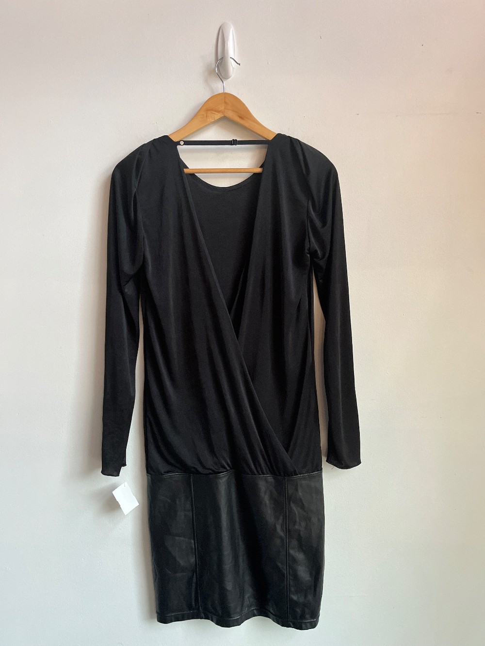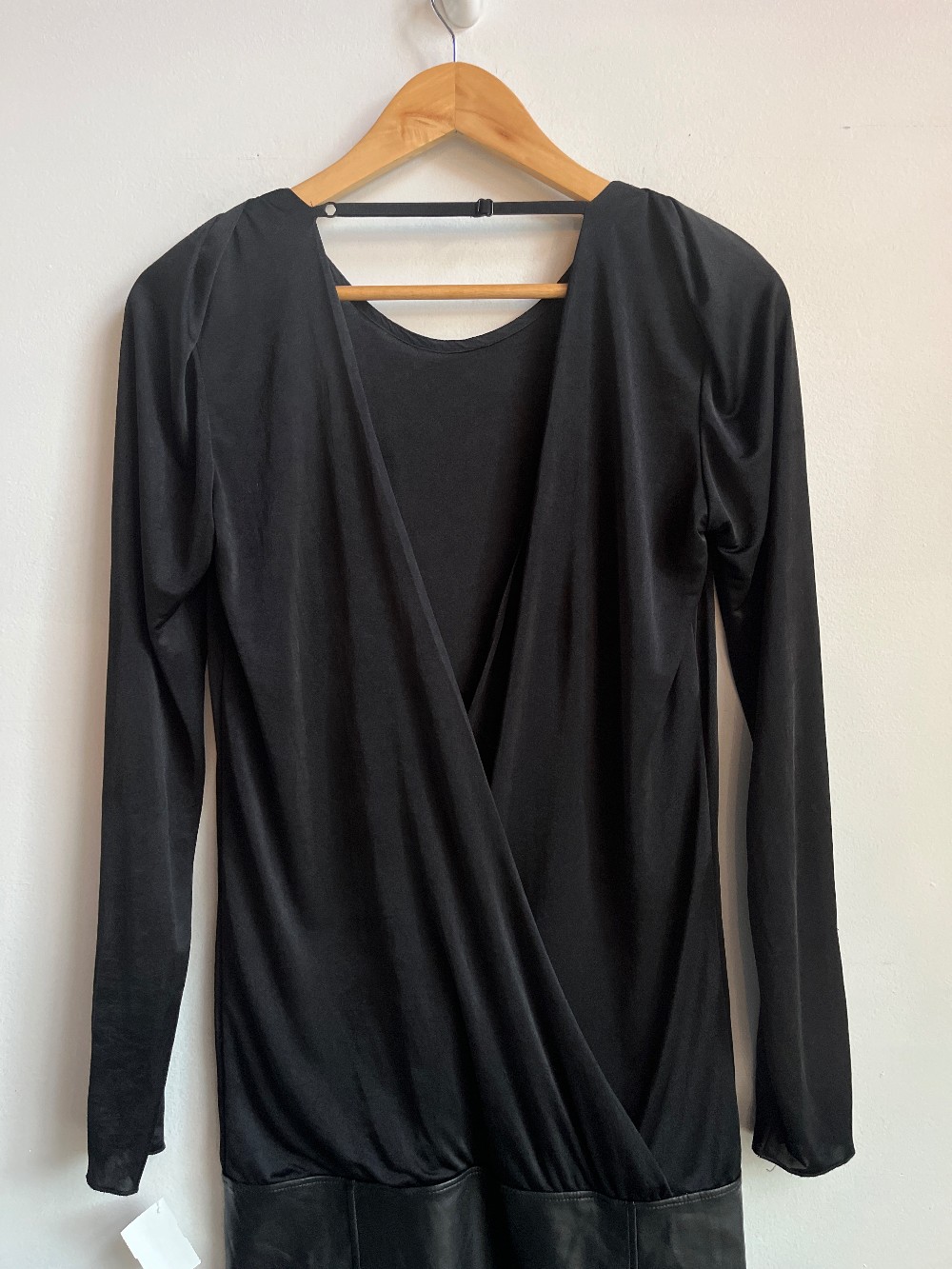 A slouchy front dress with smooth sheer fabric and a pleather bottom skirt. Features a belted neckline.