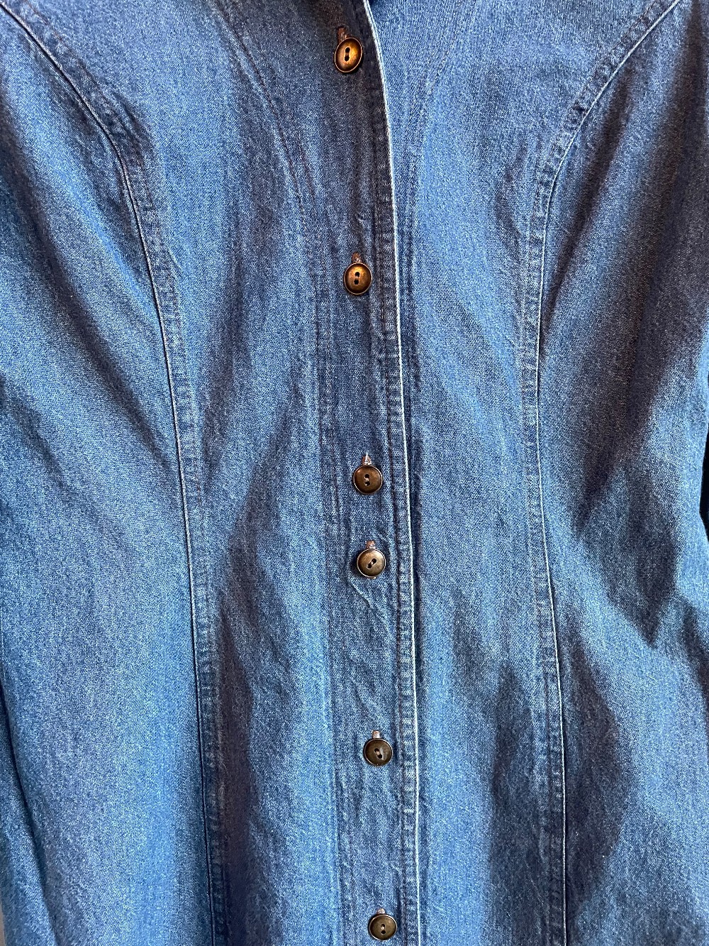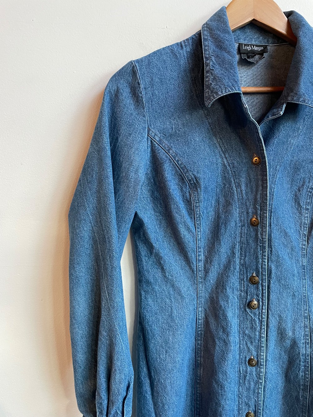 This Cute mid length long sleeve denim dress is perfect for adding an extra layer, styling with tall boots or worn with loafers or ballet flats. It is versatile and can be worn with the buttons undone as a long coat over an outfit! The piece has 9 brass buttons up the front and brown contrast stitching. It has a wonderful sharp denim collar.