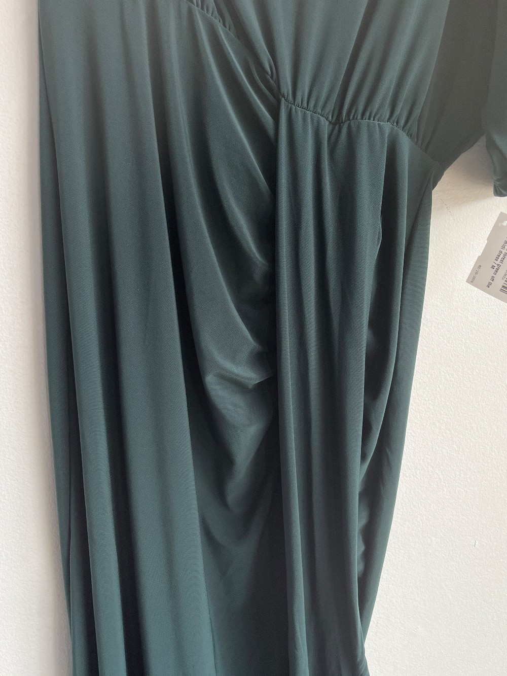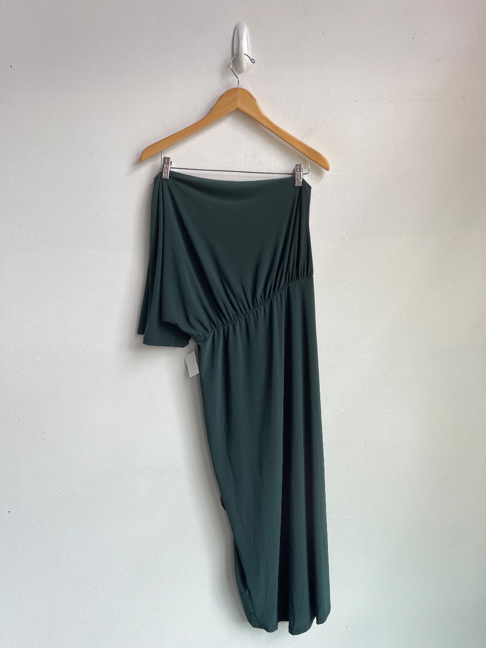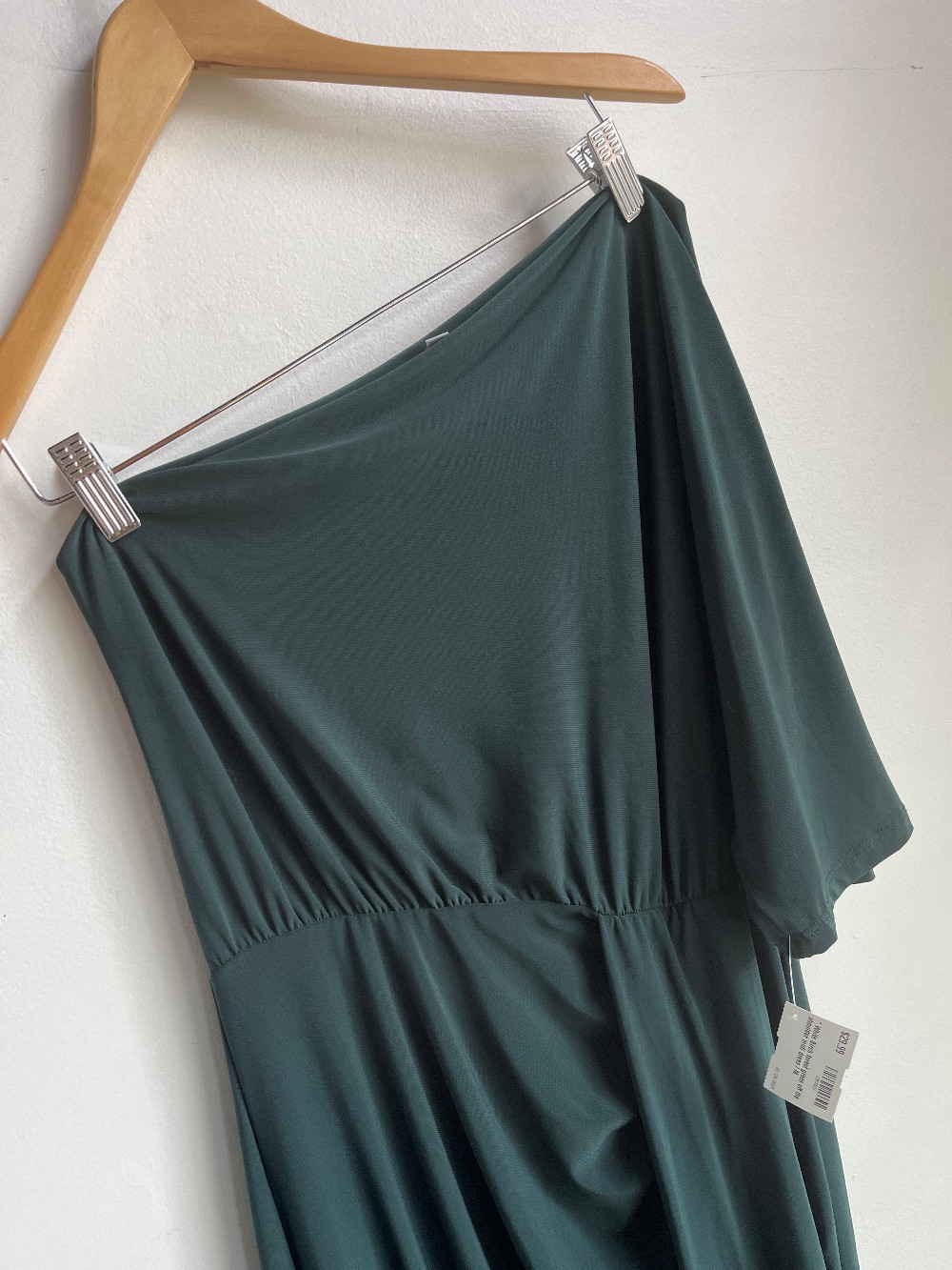A beautiful flowy and drapey forest green dress with ripples and a stretchy fabric. Features a one shoulder sleeve with a cap cut.
