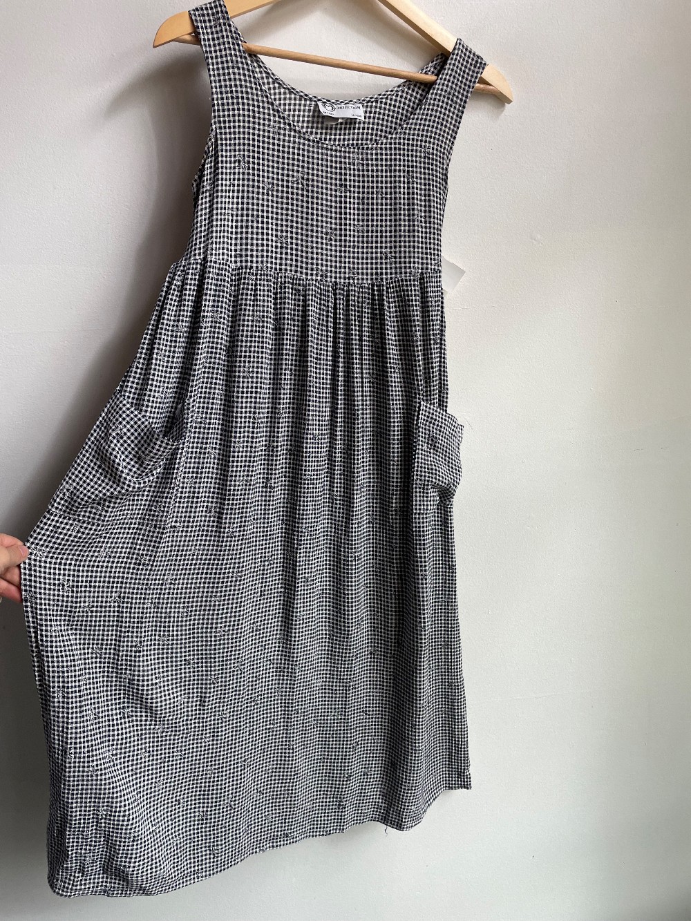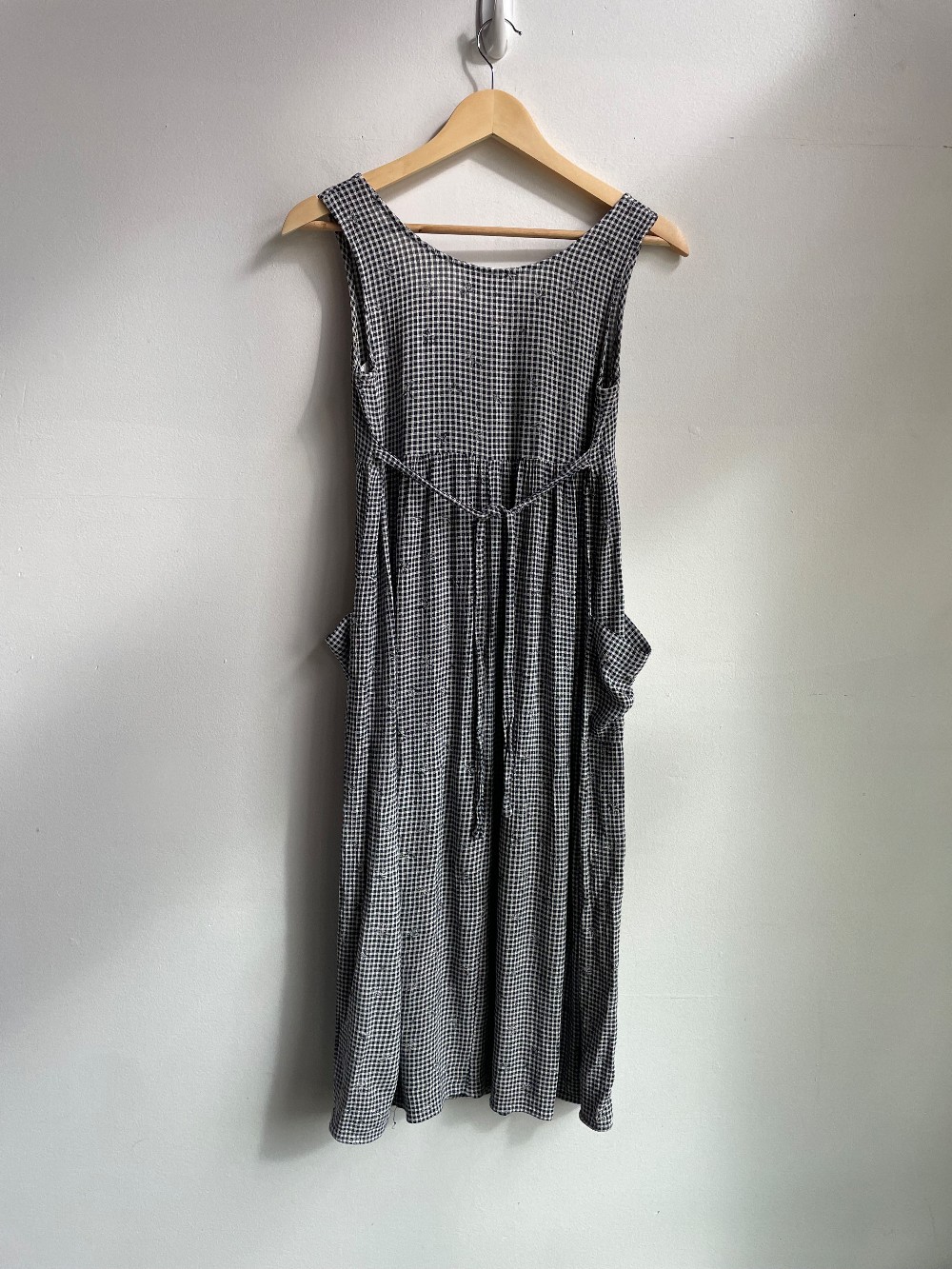 Has a tank top upper and a midi skirt length with two pockets. Features a tie waist back for cinching.