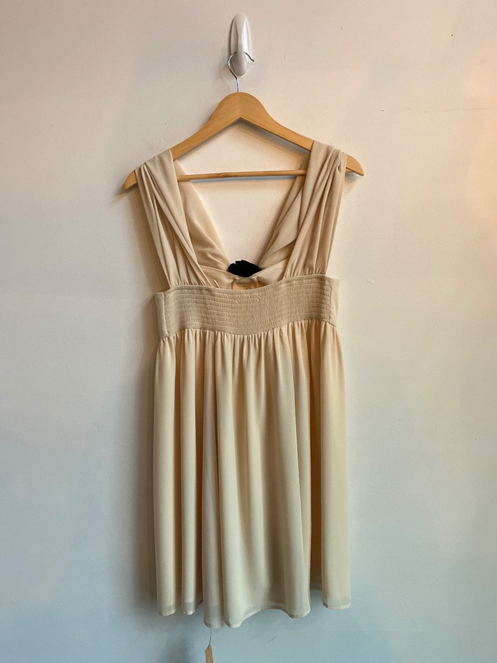 Cream off shoulder dress with a smocked back, gathered empire waist, black rosette in centre and stretchy lightweight material. Inner is lined.