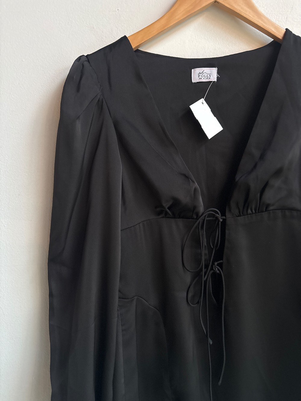 A cute puff sleeve dress with a tie up waist line and mini skirt hem. Fits with an a line skirt and a side leg slit for movement.