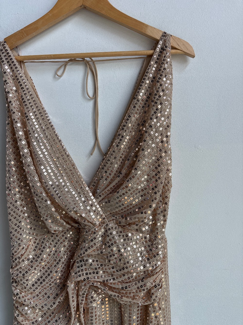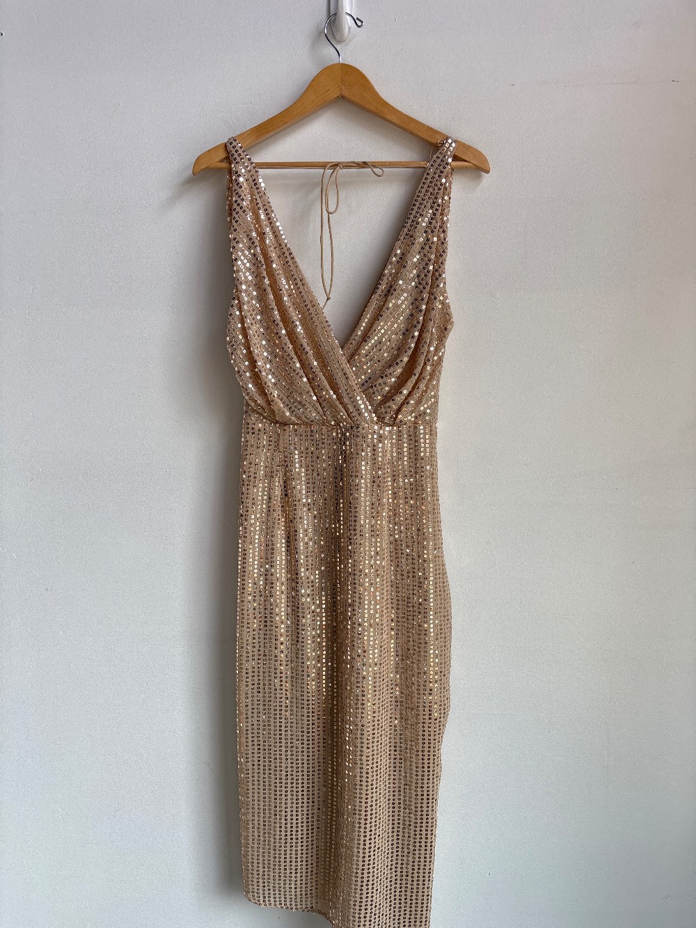 A fun and sparkly dress with a deep V neck/ back, sleeveless fit, gathered waist, side slit and inner lining