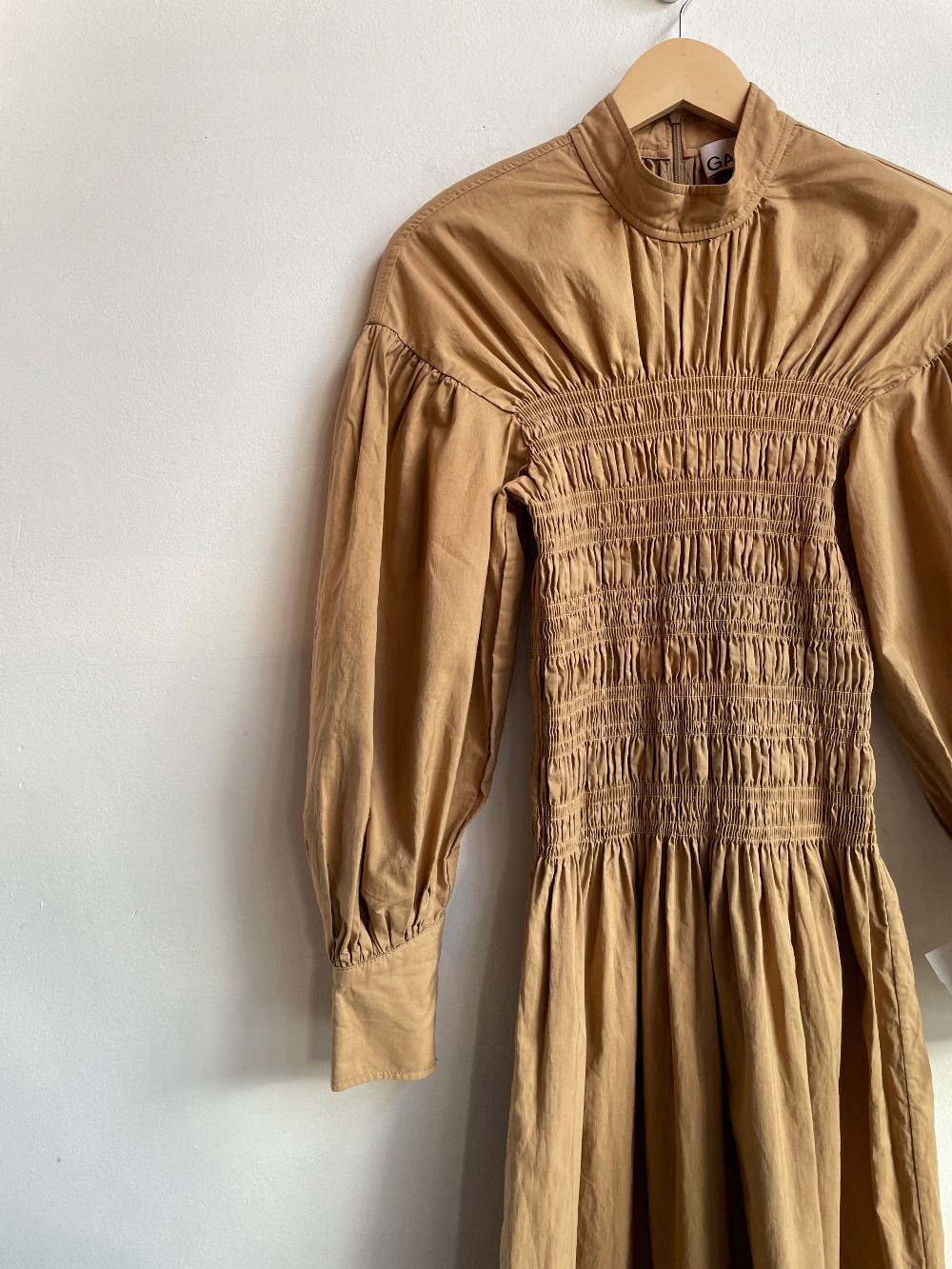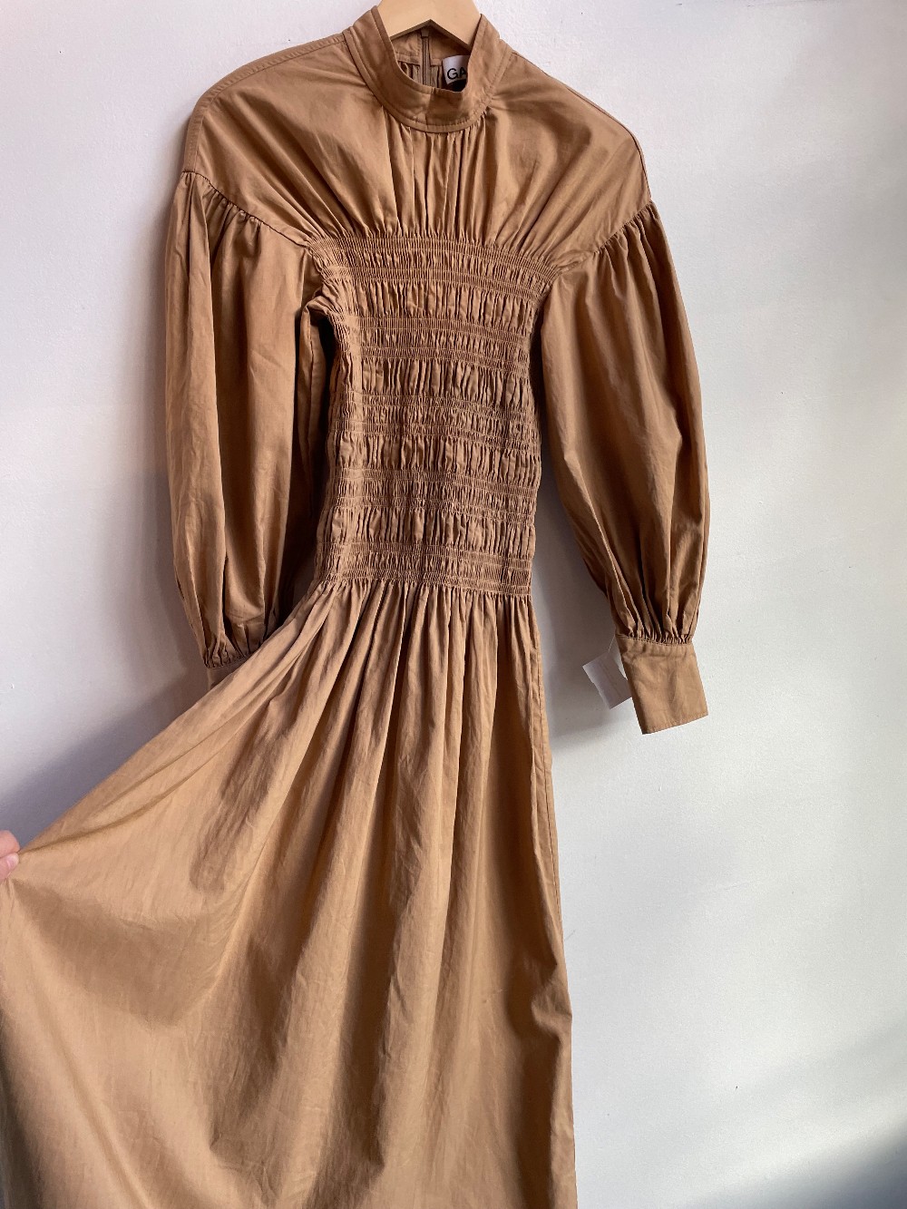 Stunning Organic cotton and Linen Blend Maxi length dress with a smocked torso, High neckline and voluminous balloon style sleeves. Has a Zip back closure and no inner lining.