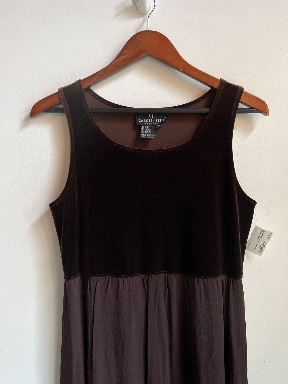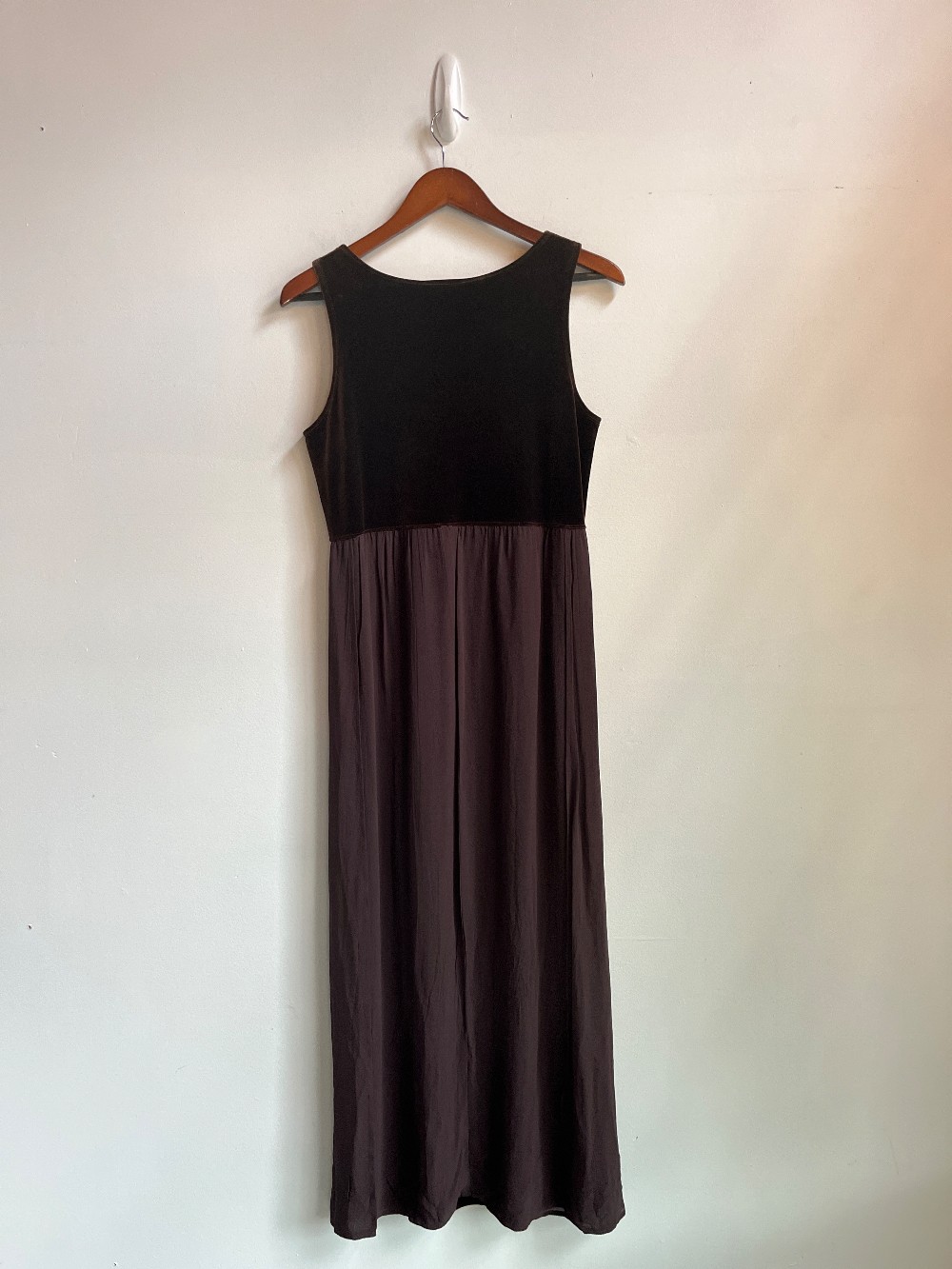 A cute maxi dress with a brown velour sleeveless top, empire waist and satin skirt over brown velour. Made from a poly and spandex blend,.