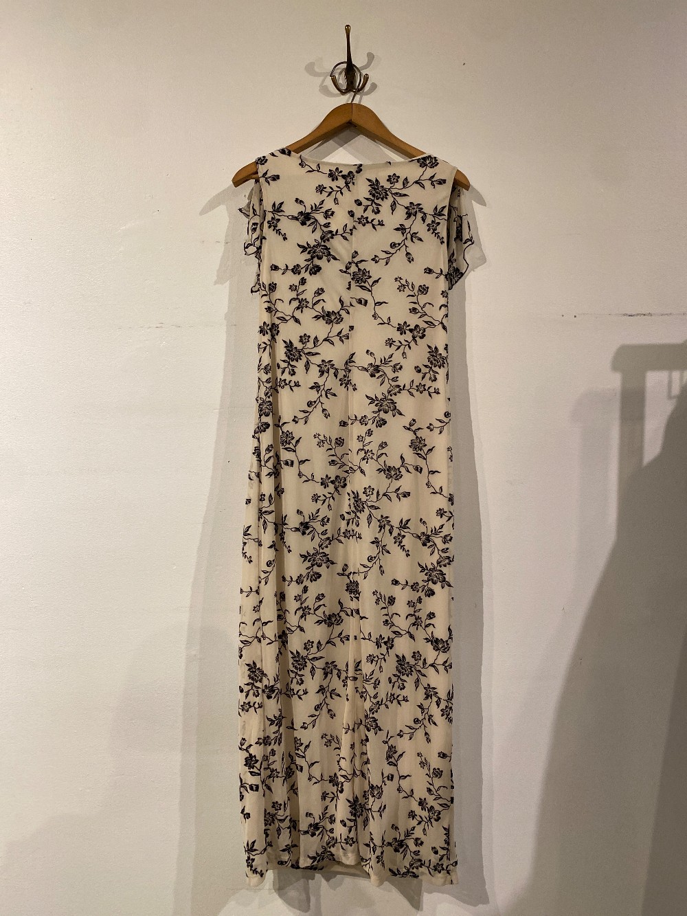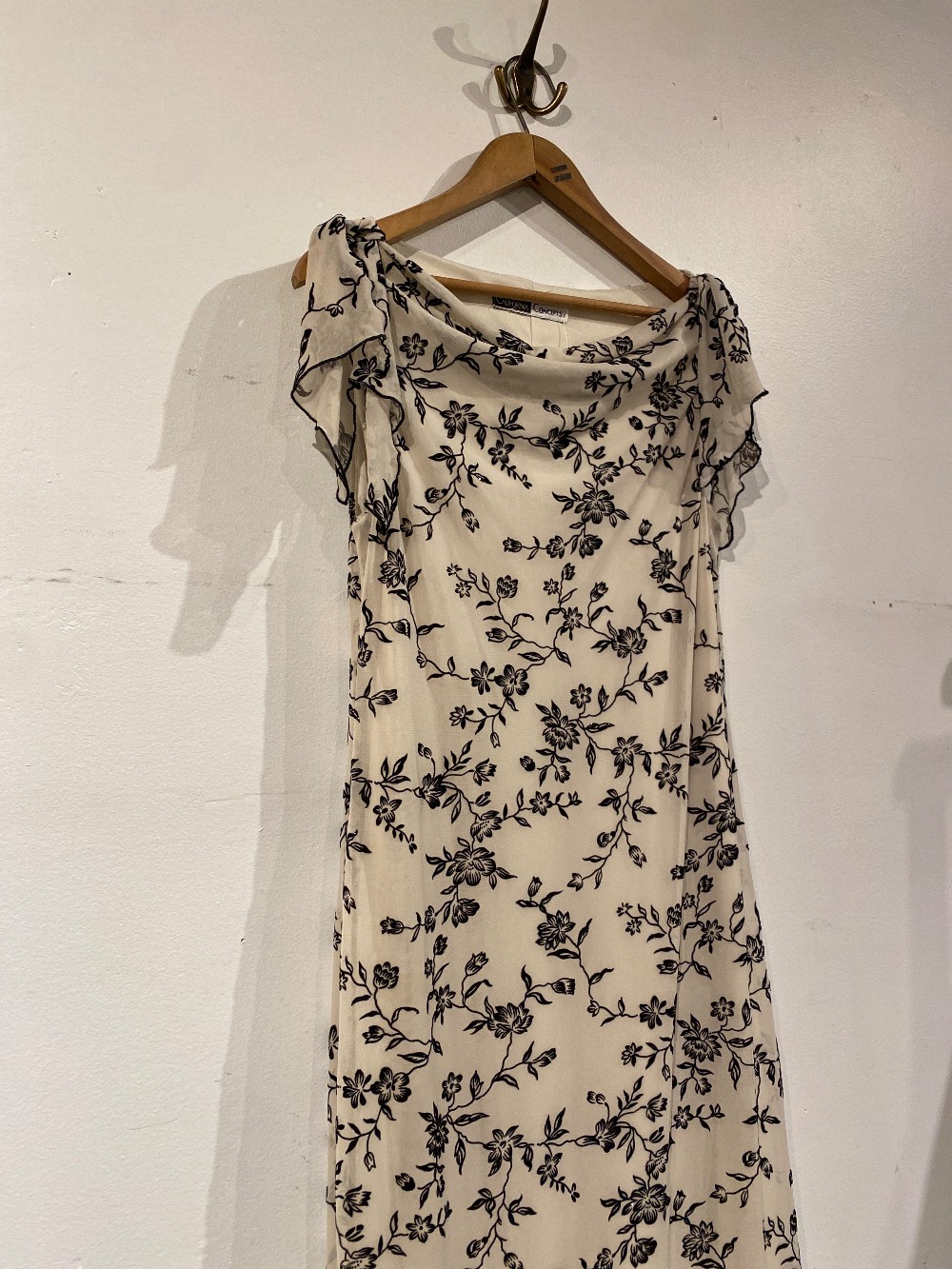 Fitted midi dress with black sparkle print all over, inner lining, boat neck and ties on shoulders. Fabric feels like a stretchy poly material.