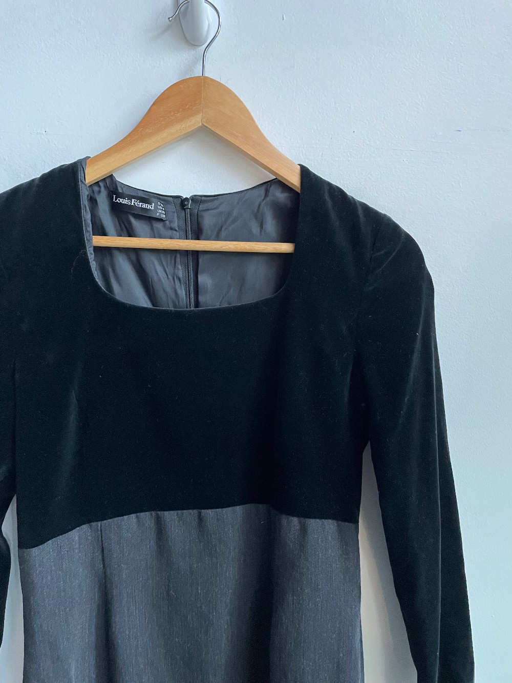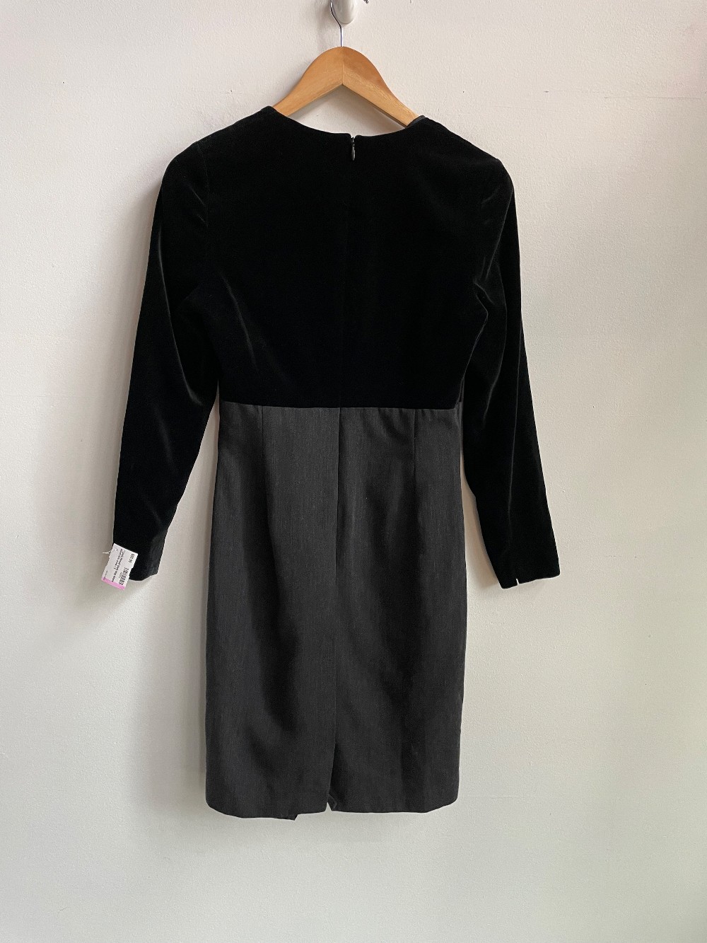A designer dress! Long sleeve, scoop neck, velvet top mini dress with a back zip closure and inner lining. Material has no stretch