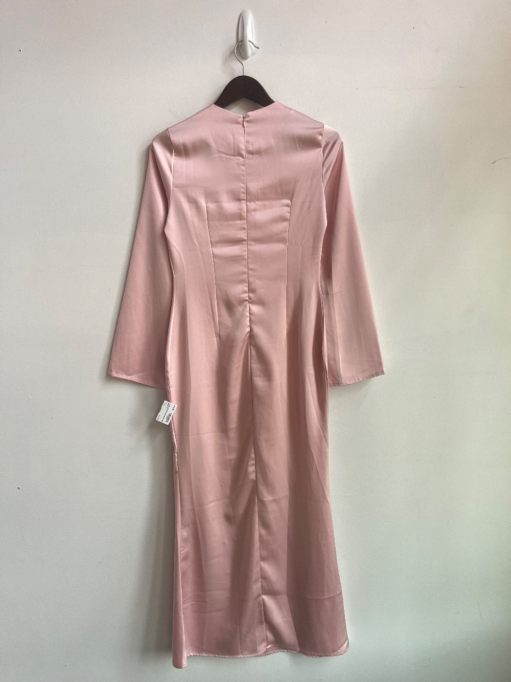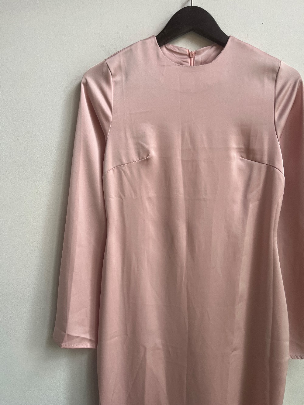 Has no stretch, recommend trying on in store. A luxe maxi dress made from heavy satin. Has a high neck, long sleeves, back zip closure and tapered fit.