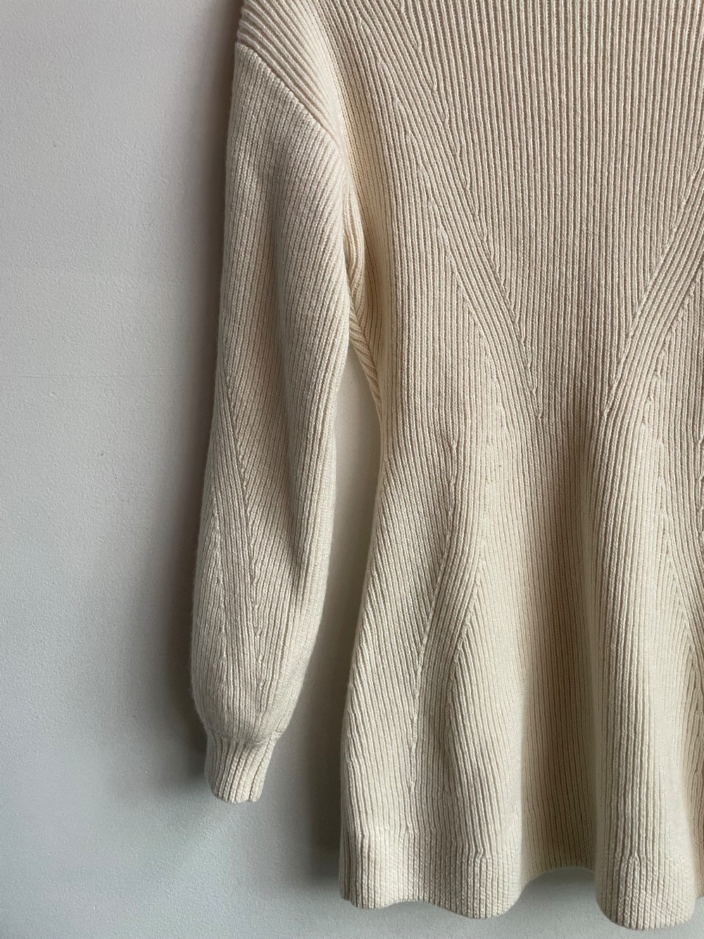 A thick ribbed knit mini dress with long puff sleeves, a high neck, wool/ cotton blend knit material and lots of stretch!