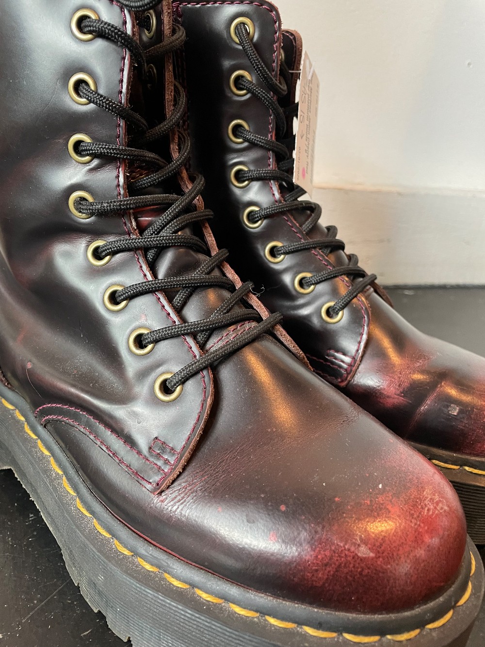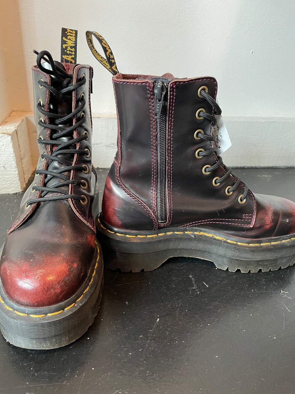 AS IS - Minor scuffs in leather - A full-volume revamp of our iconic 8-eye boot, the Jadon retains all the 1460's original details — grooved edges, yellow stitching and an AirWair heel loop — and adds a towering platform sole. This pair comes in the brand’s cherry red Arcadia, a classic rub off leather that's designed to tarnish with wear.