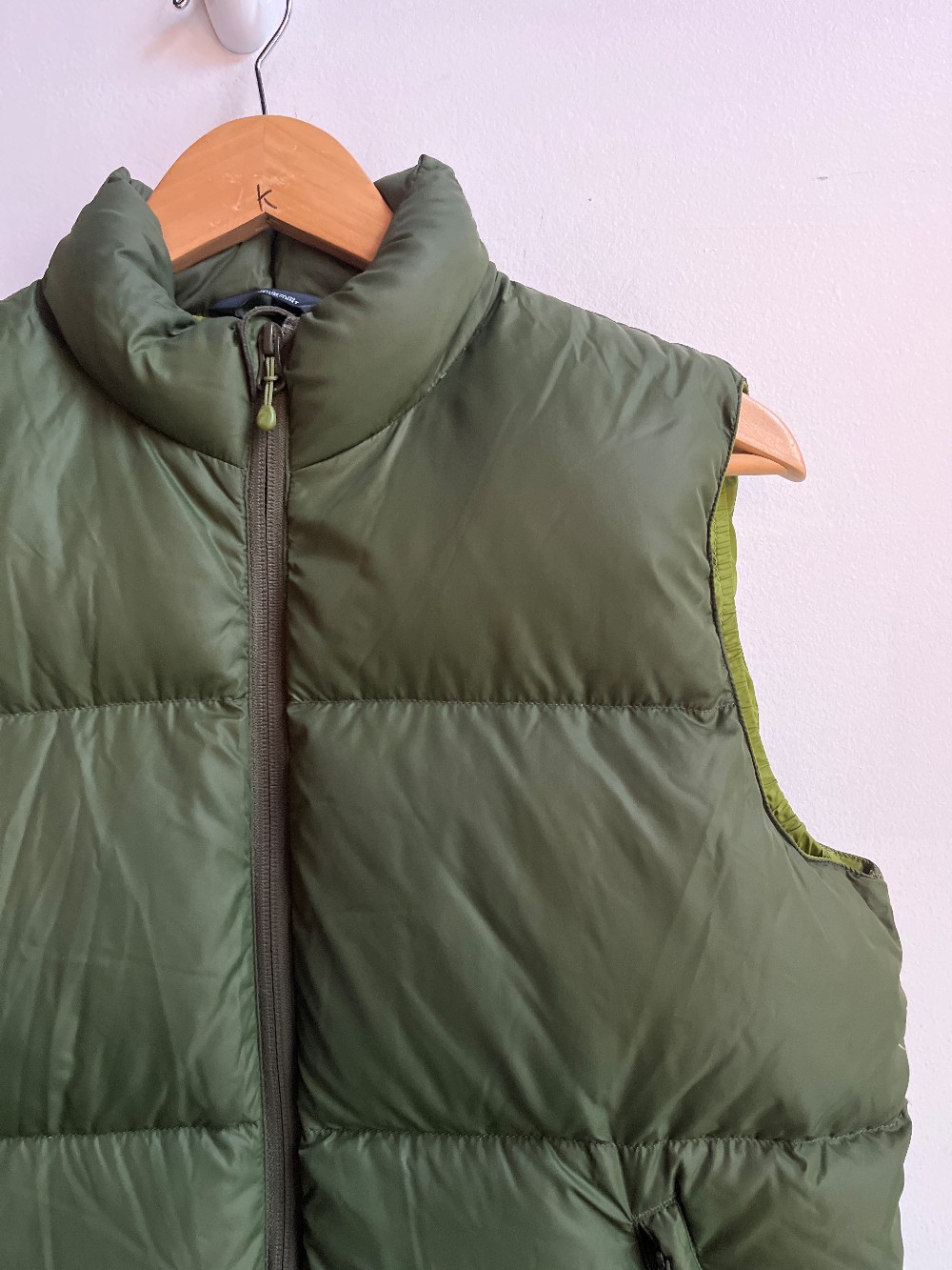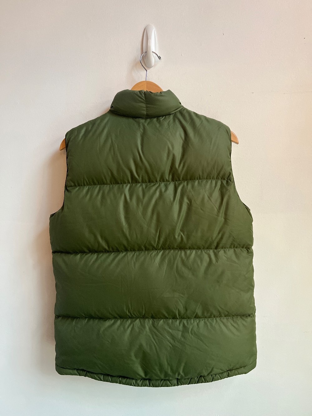 Would fit small to medium best. A thick puff vest with a zip up front, side zip pockets and high neck. Outer is nylon and inner is down mix
