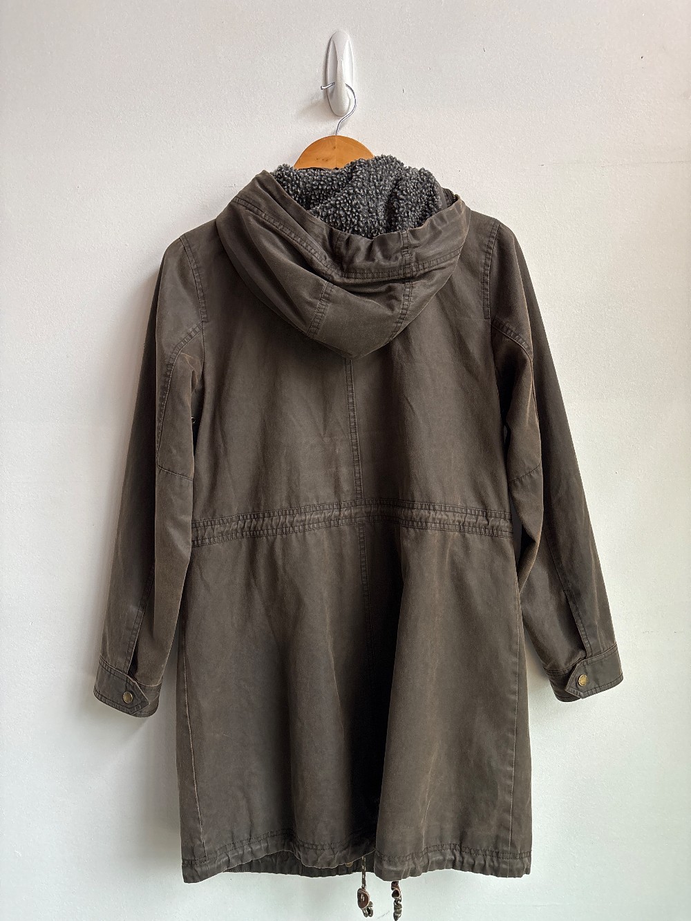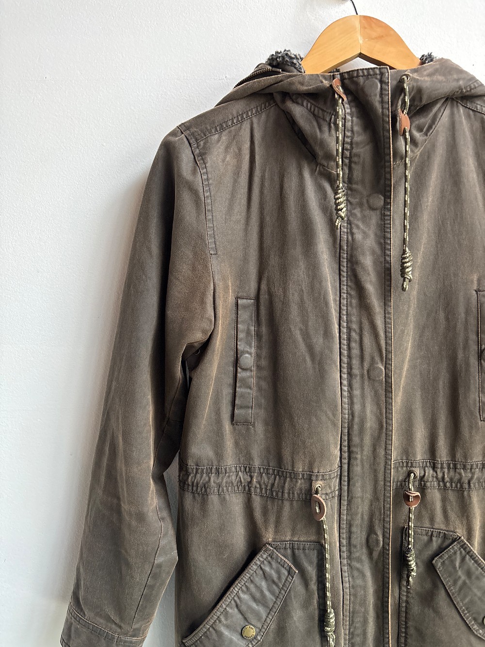 Mens sizing! A heavy parka cargo jacket with a zip front, cinched drawstring waist, long hem, large side pockets, inner lining, fleece hood inner and cotton blend outer with wax covering