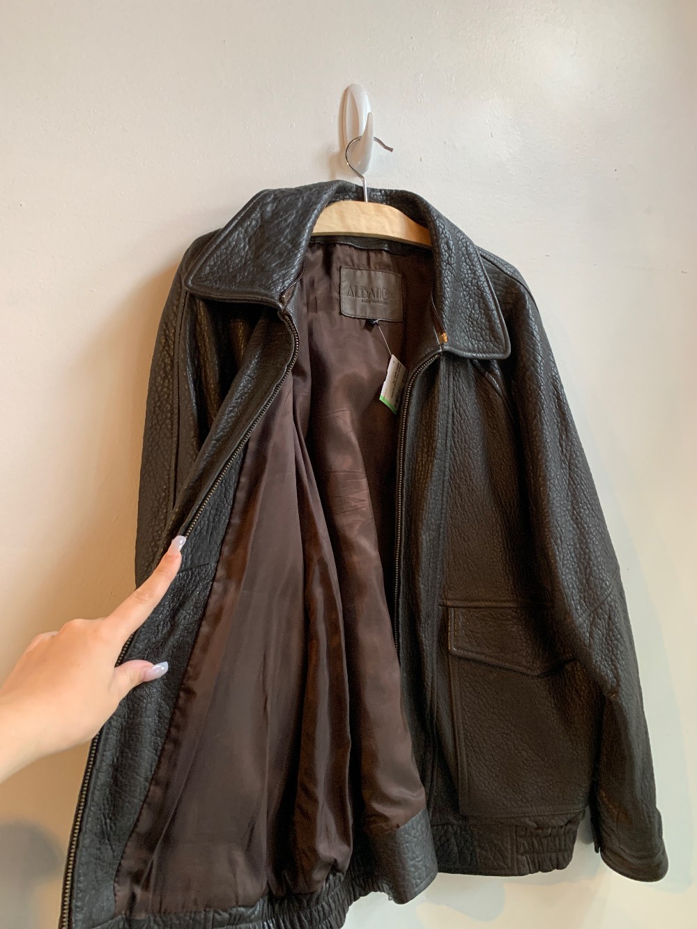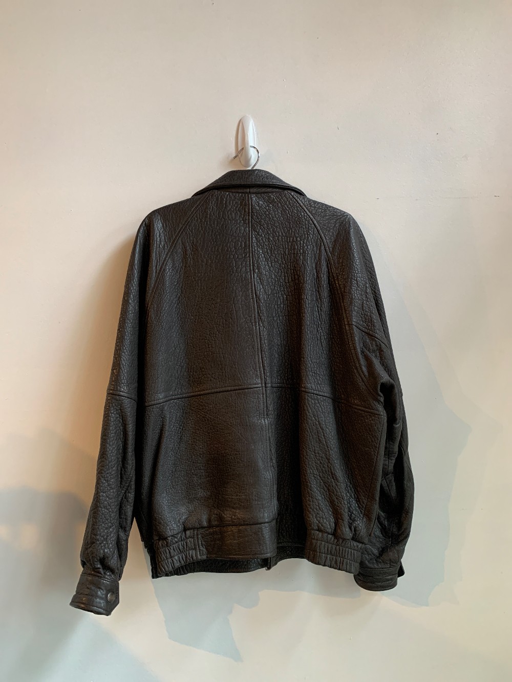 Men’s vintage pebbled leather jacket! Features a zip front, two pockets, and full relaxed sleeves. Wonderful condition! Has brown satin inner lining.