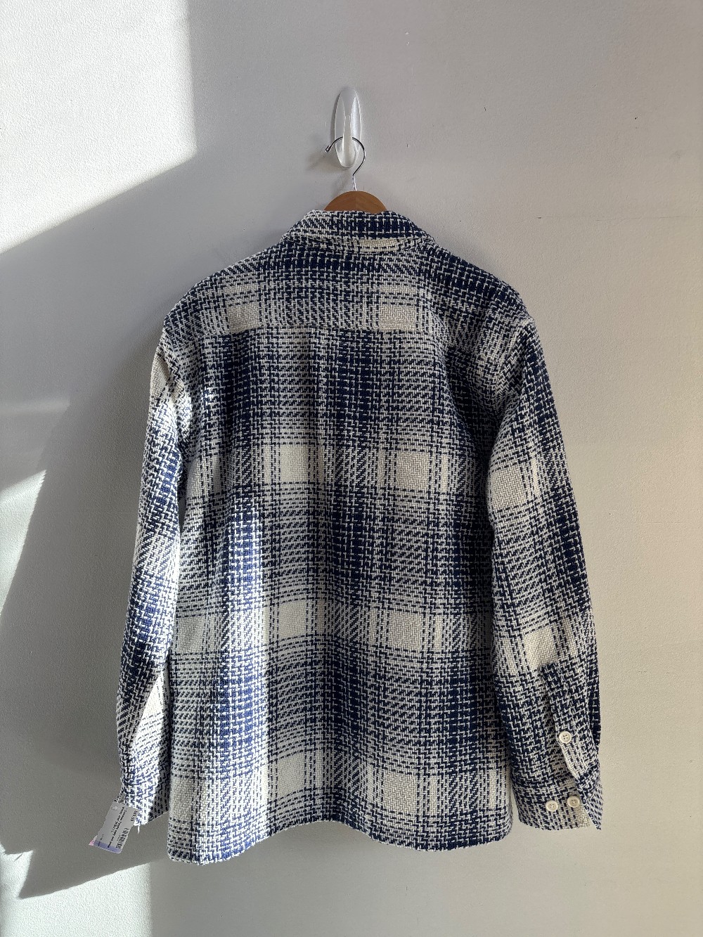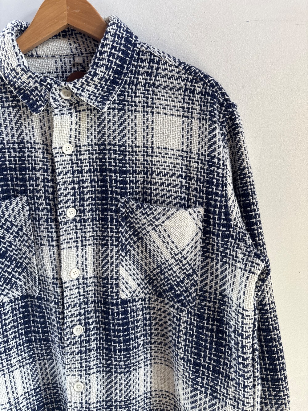 Mens sizing! A woven style shirt jacket with navy and white check print. Made from a heavy material, has a button front and front pockets. Fabric is a poly/ acrylic/ nylon/ wool blend
