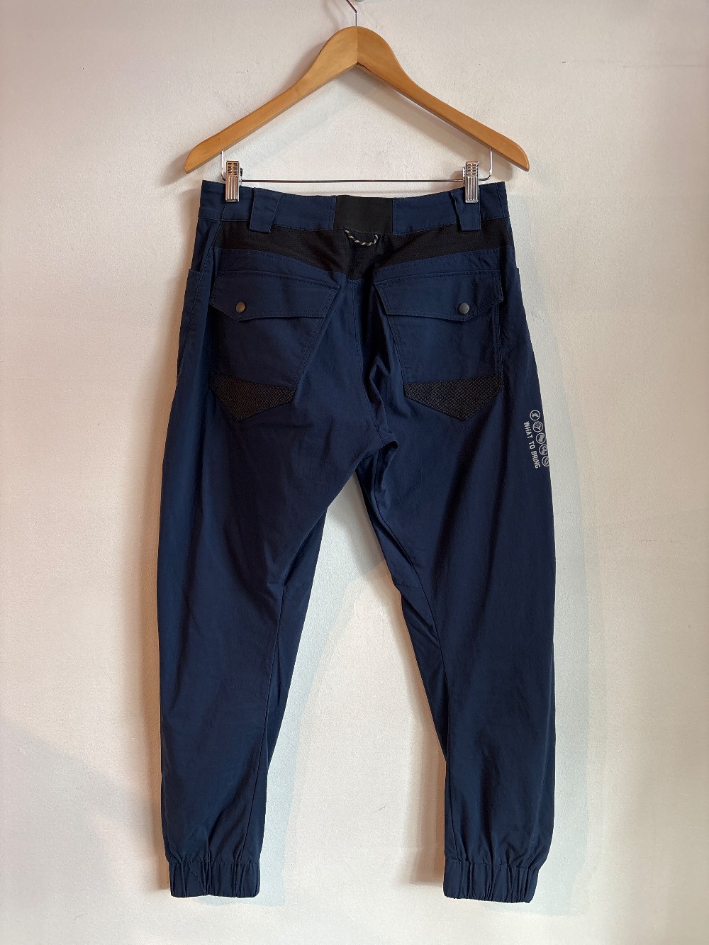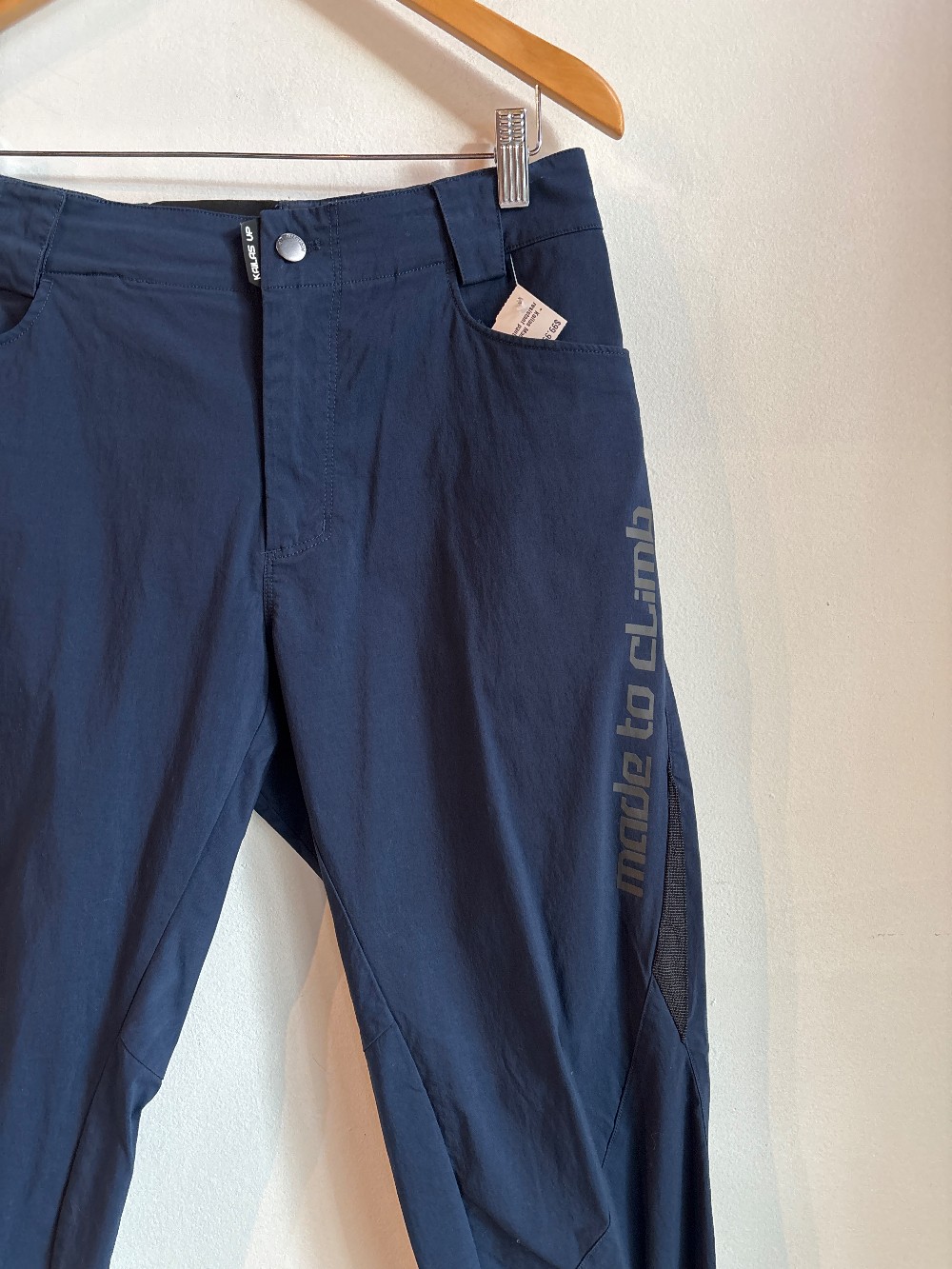 Men’s sizing! A water resistant, durable pair of climbing pants. Features a hidden zip fly, one leg pocket, four upper pockets, belt loops, and a tapered cinched ankle hem style.
