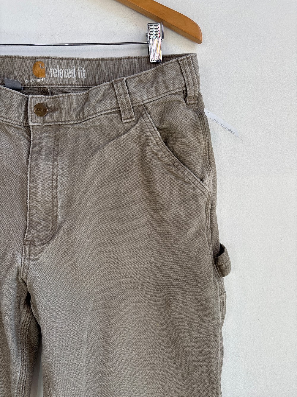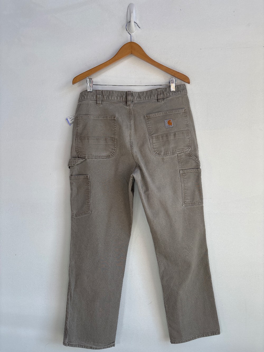 As is: minor tear on front right pocket. Made from durable heavyweight cotton duck, these Carhartt men’s dungarees have a relaxed fit that leaves you room to bend and move comfortably on the job. Great for tasks like laying tile or resetting a fence, the pants feature Rugged Flex® technology to allow you to kneel or squat easily. The work pants feature plenty of pockets to keep your gear on hand, and the back pockets have been reinforced and lined to help them accommodate heavier items.