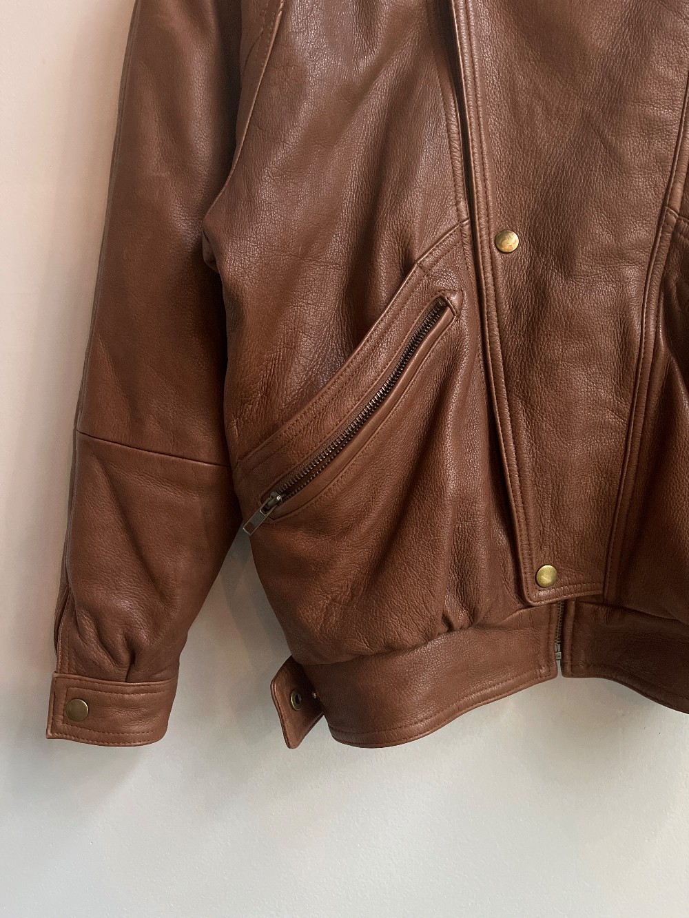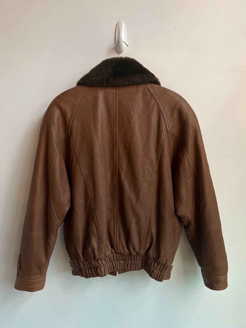 Men’s sizing! A thick soft pebble leather jacket with a removable fur collar. Features a hidden zip down button up front, four pockets, and slip up sleeve cuffs.