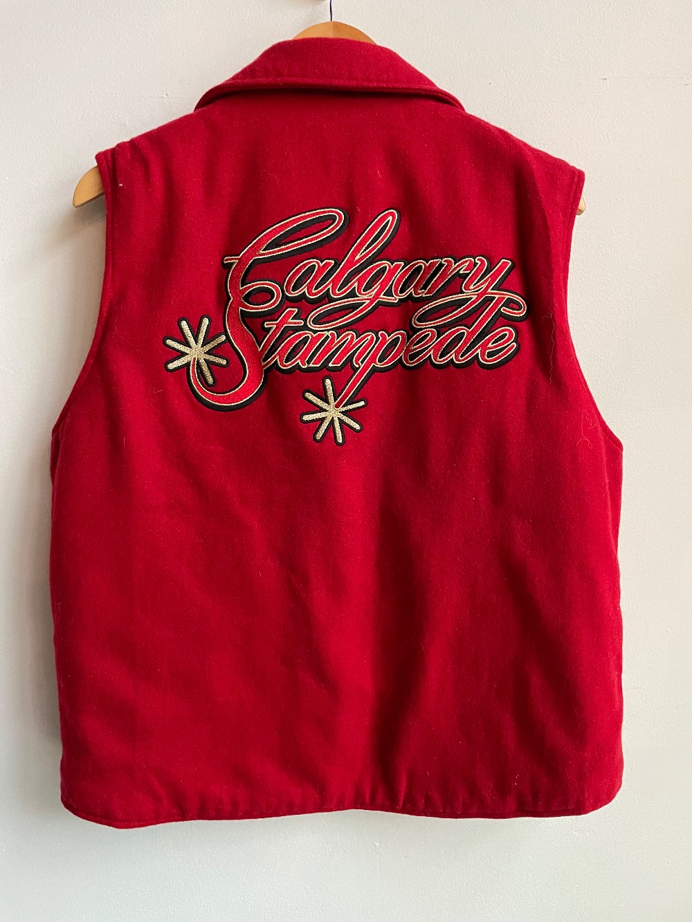 * M in mens sizing. This amazing fire truck red collared vest with snap button closures up the front is a groovy layering piece. It has two buttoned flap pockets on the front waist and one zipper pocket on the chest. The back has popping “Calgary Stampede” gold, red and black embroidery across the back.
