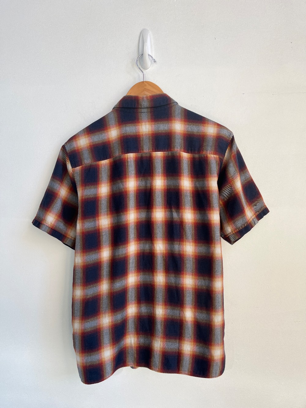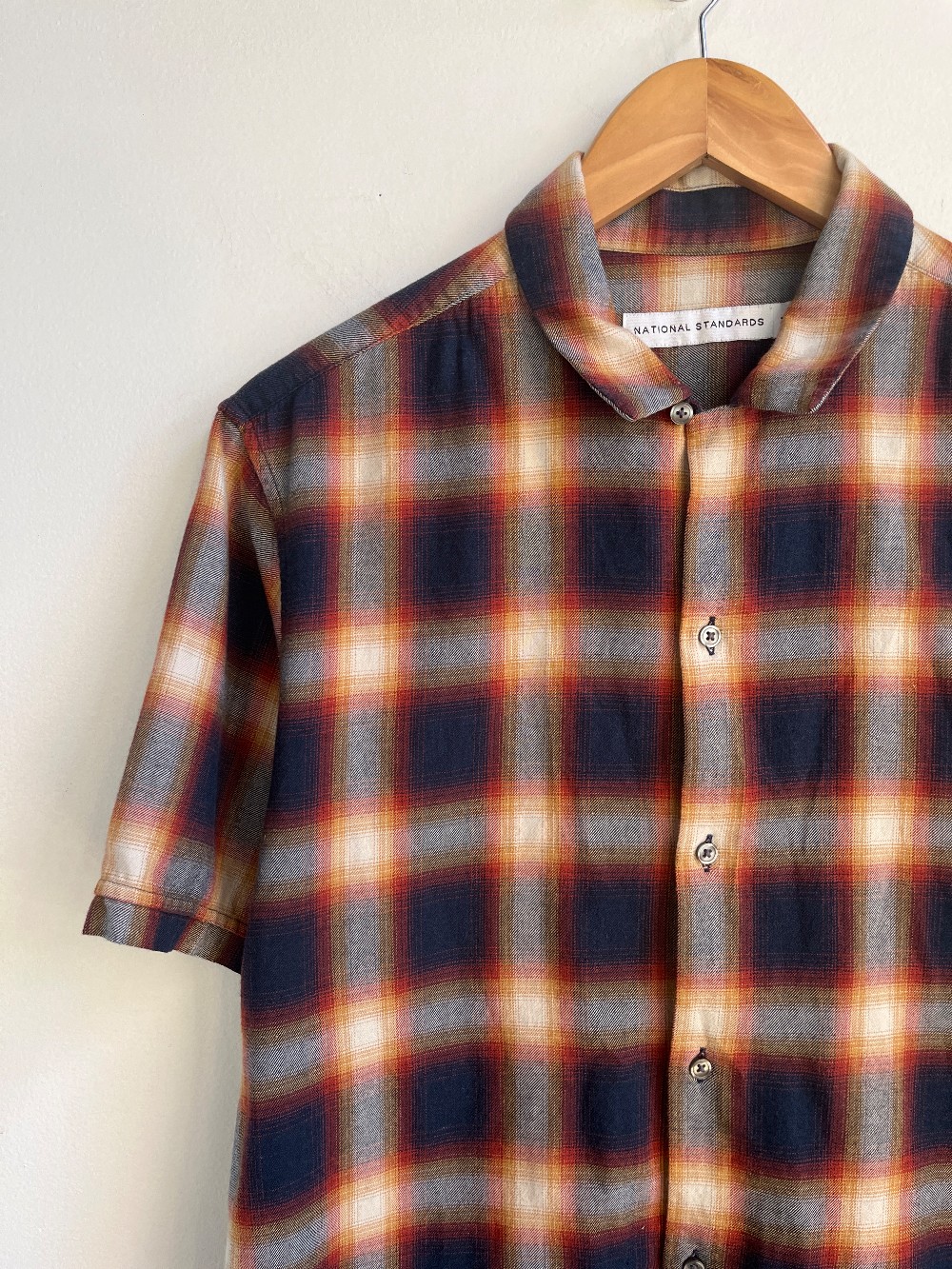 Men’s sizing! A multicoloured plaid top with navy, red, and orange hues. Features a point collar, button down front, and short sleeves.