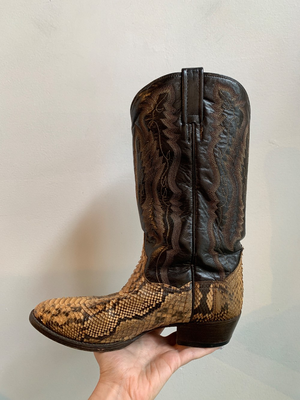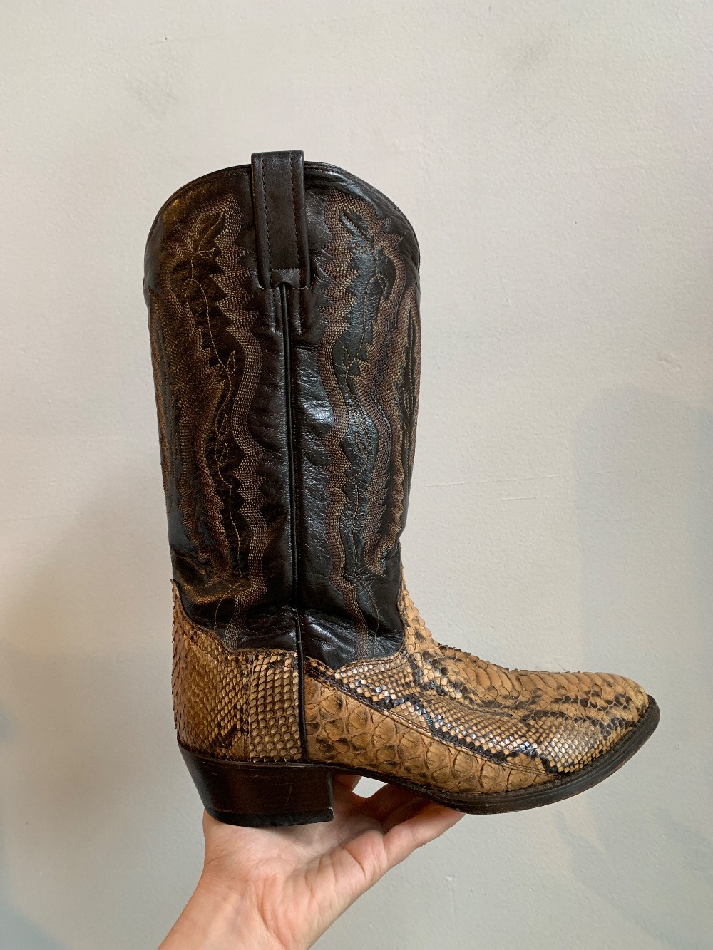 AS IS: some white markings along the left boot. Men’s sizing! A cool pair of real snake skin boots made from a beige and black scaly leather. The upper leg is made with black leather and brown and cream embroidery. Features pull tabs, wooden soles, and a 2 inch heel.