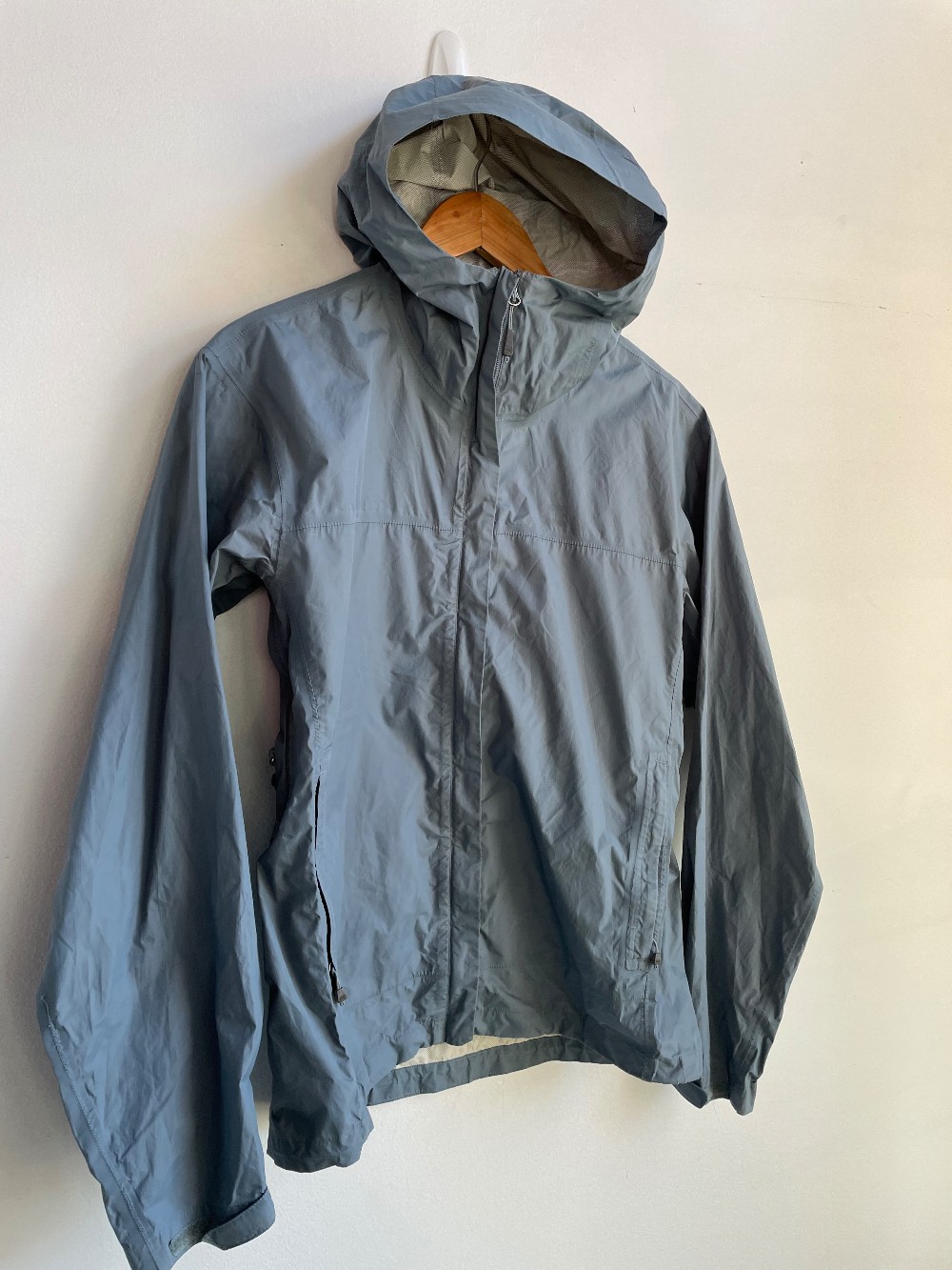 A lightweight rain shell with a zip front, high neck, hood, underarm vents and side pockets. Made from Nylon with polyurethane coating
