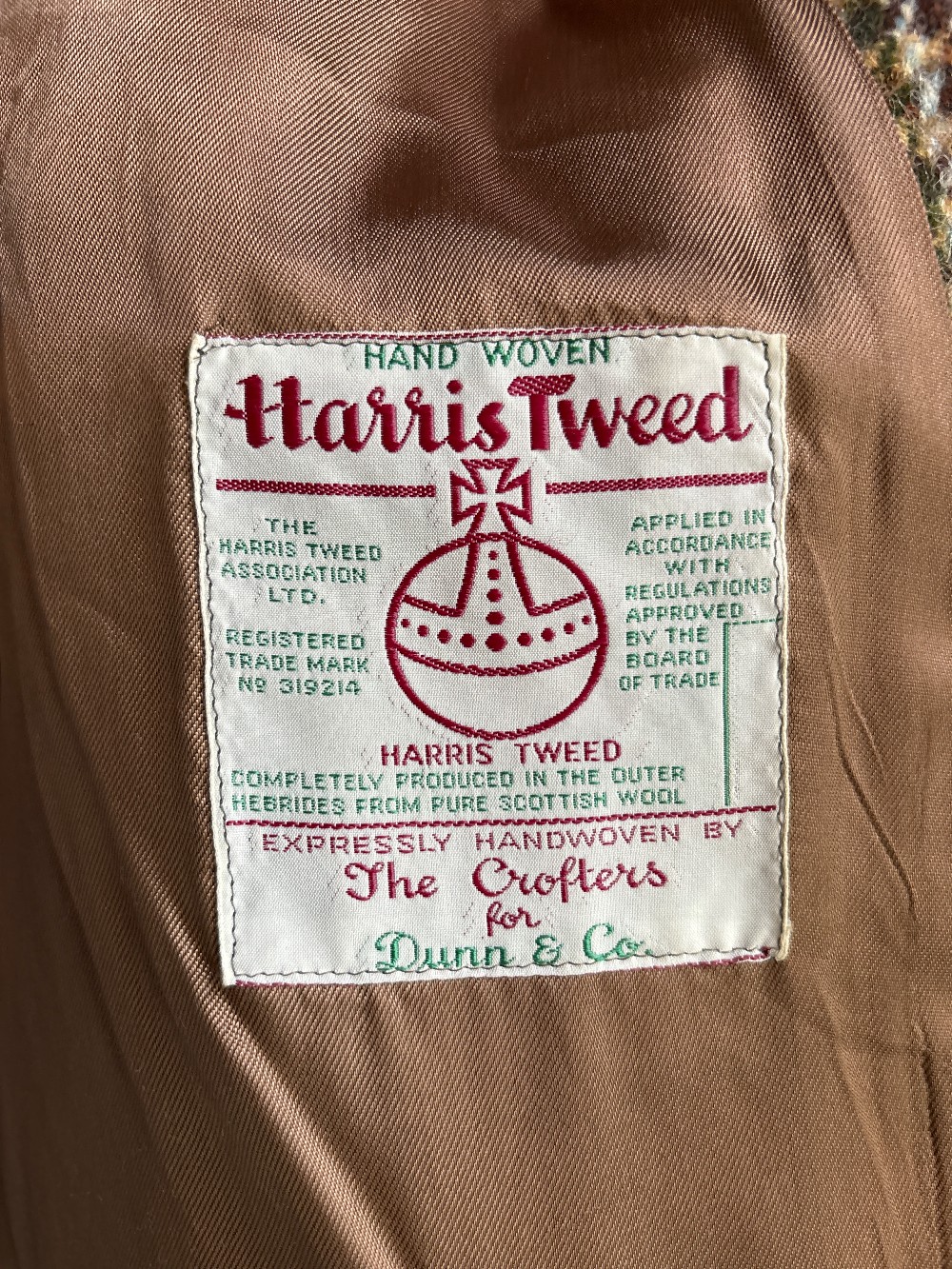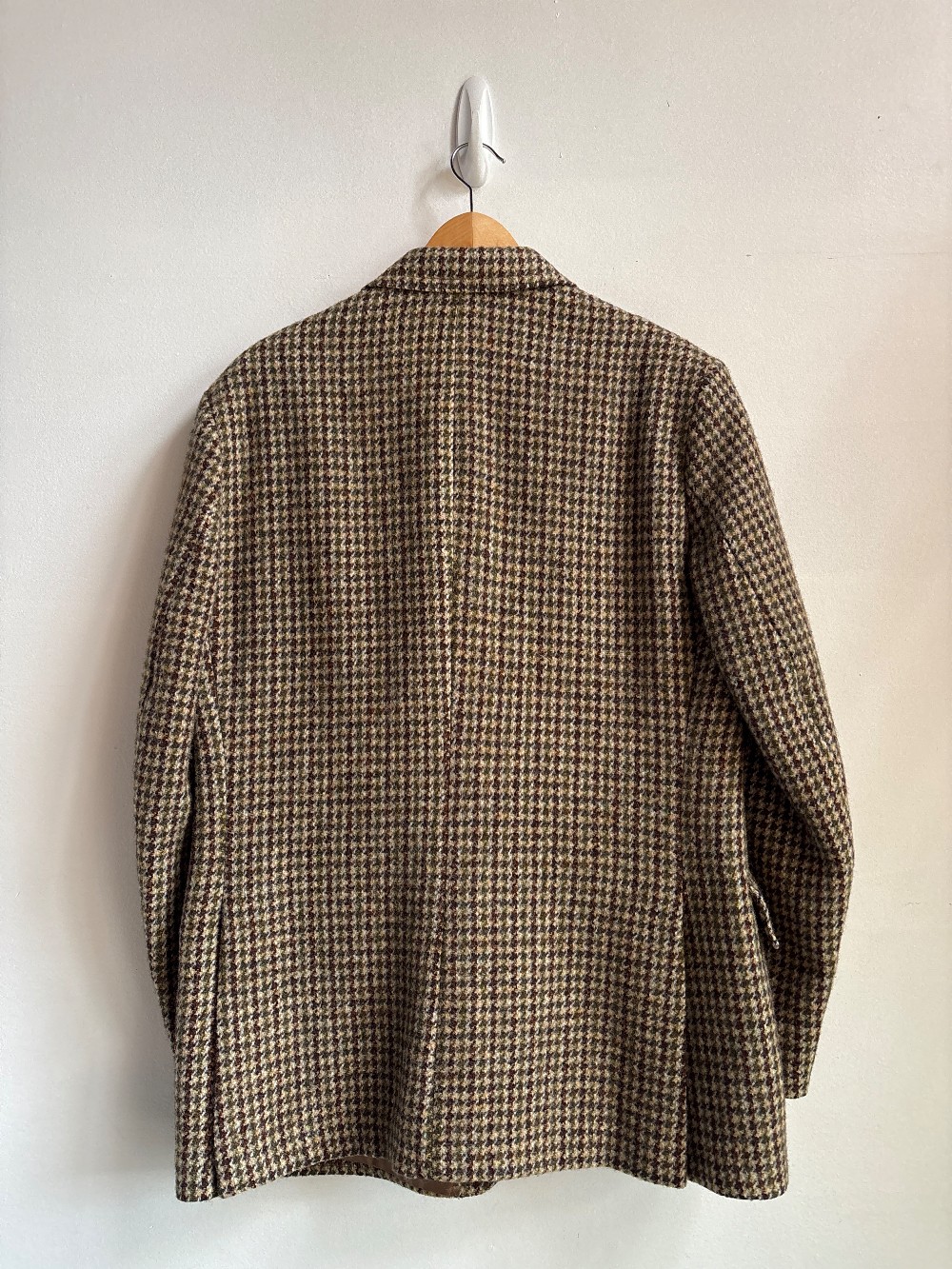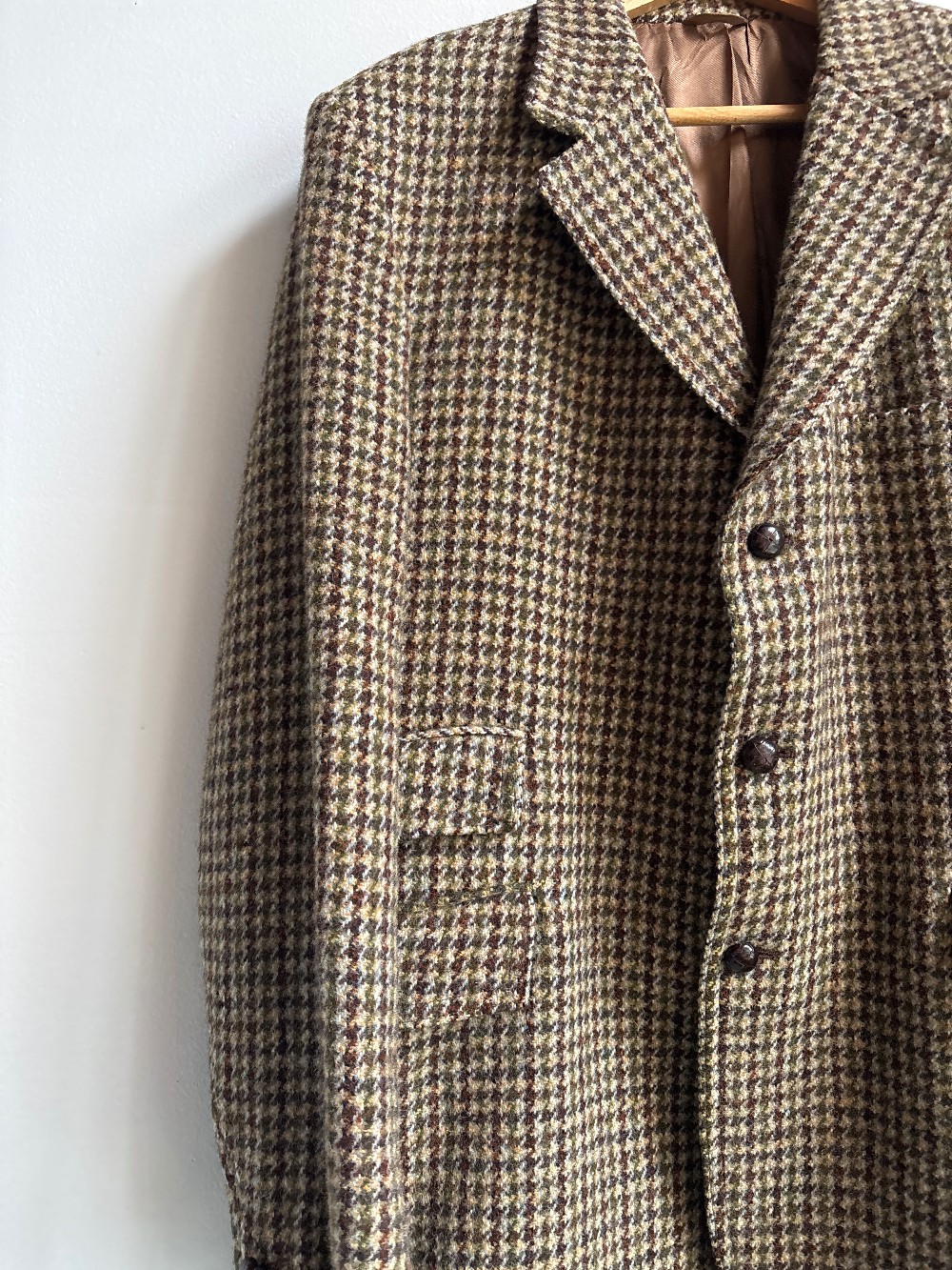 Valued over $600! Would fit Large best. A vintage wool blazer with a tweed print, button front, inner lining and side pockets. Made from Hand woven Scottish wool