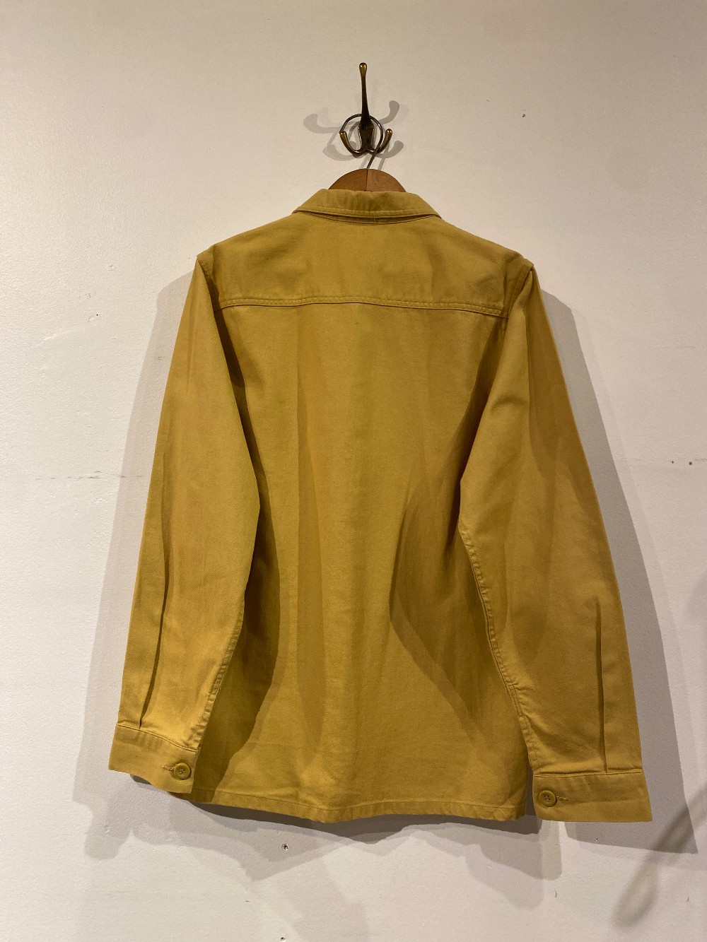 Would fit a Med-Large mens best. A classic chore coat in a mustard colour. Metal snap fastening down the front, on the collar and the cuffs. Large patch pockets and smaller patch pocket at chest. Made from cotton.