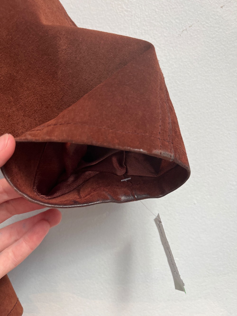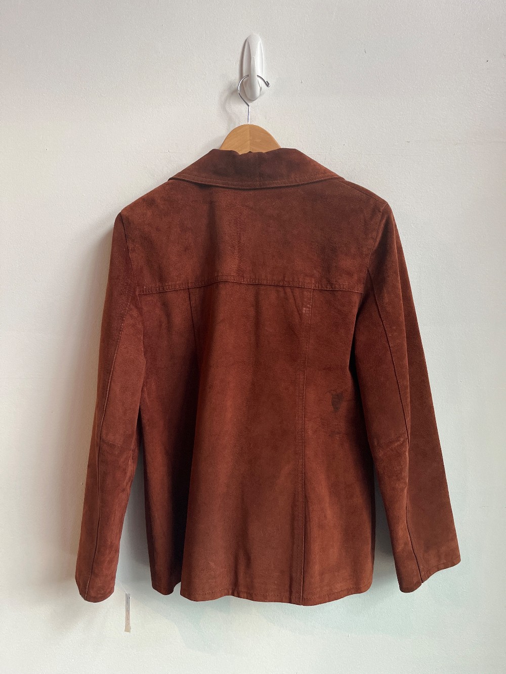 Mens sizing! As is: wear on neck and cuffs. Made in Ontario! A gorgeous suede jacket with a button front, inner lining, side pockets, collar and structured fit.